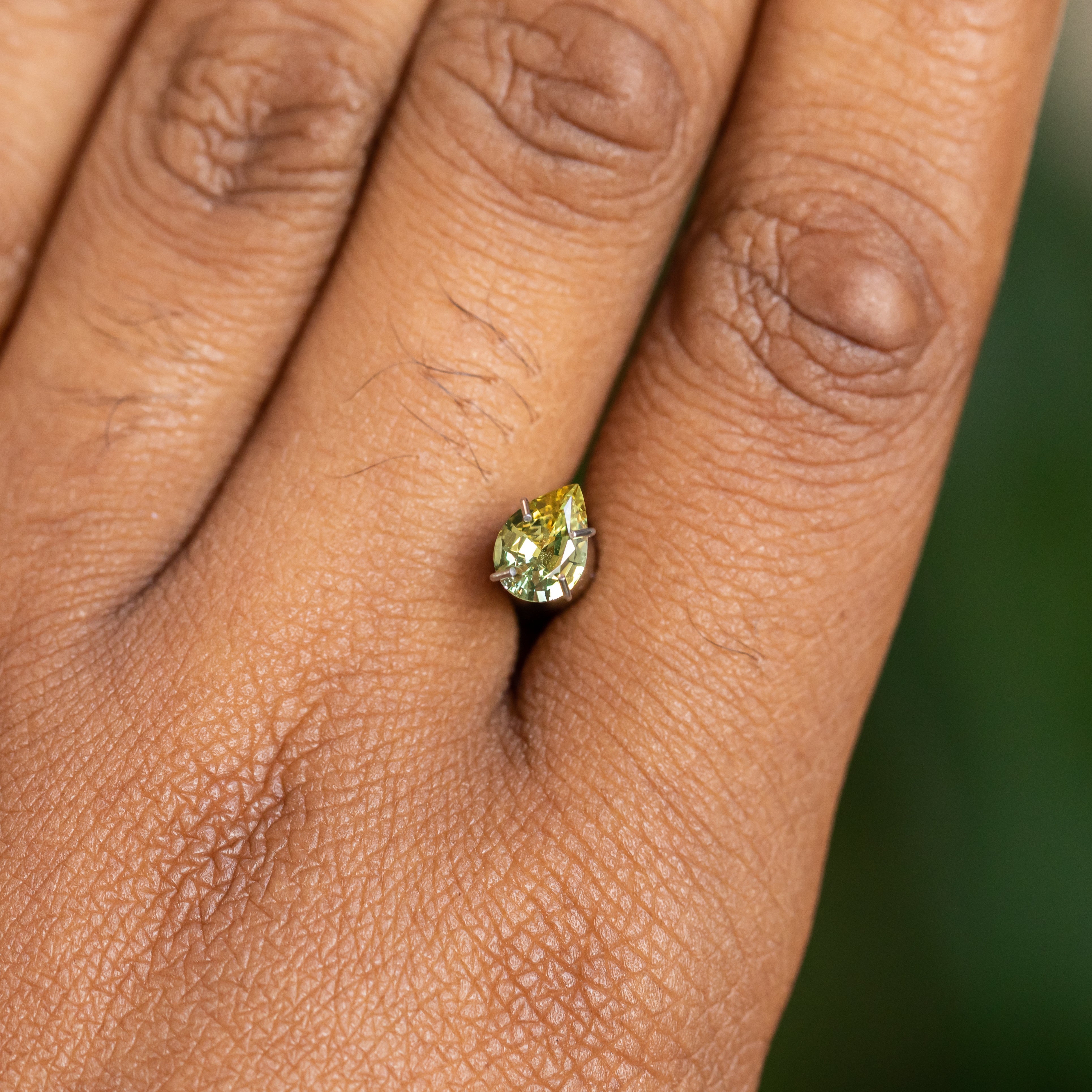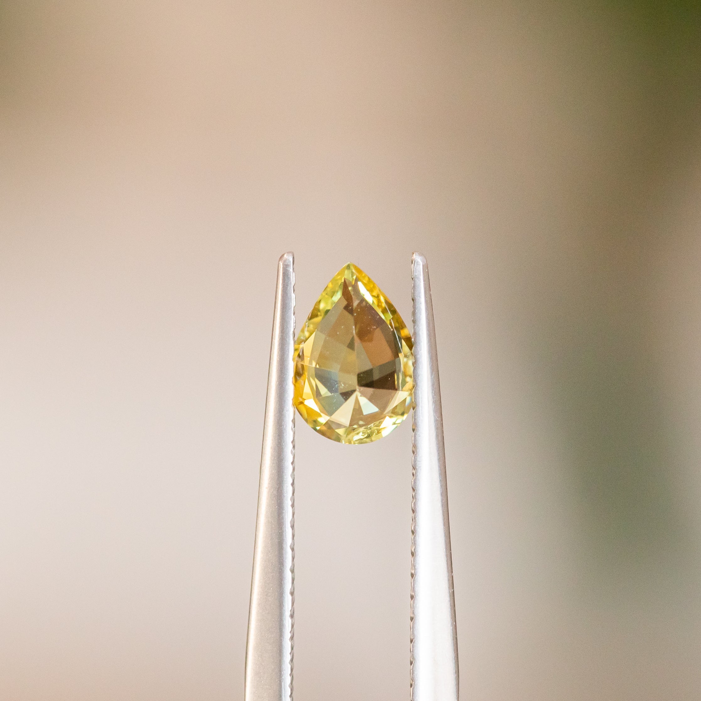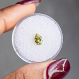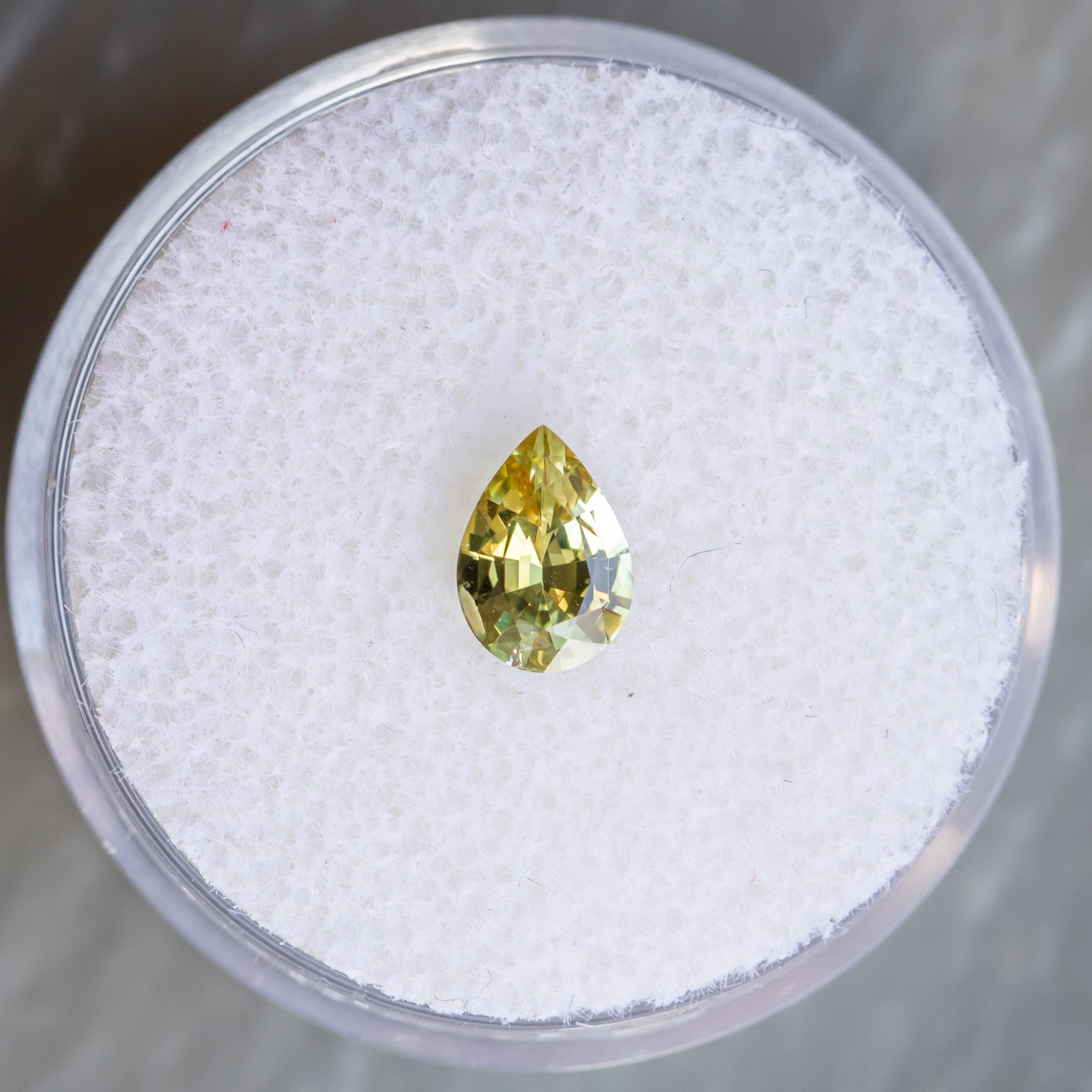 0.69CT PEAR MONTANA SAPPHIRE, PARTI LEMON LIME, 6.91X4.95X3.52MM. Vibrant, rare yellow sapphire mined in Montana, USA. Has some light silk but overall very sparkly and brilliant!
