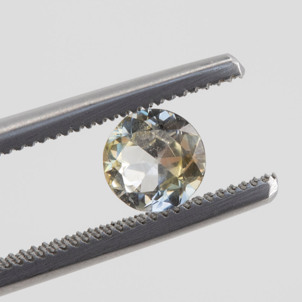 0.78CT ROUND MONTANA SAPPHIRE, YELLOW WHITE PINK PARTI, 5.69X3.10MM (Unheated). This is a beautiful little Montana sapphire! At just under 6mm, this would be great for a dainty solitaire or surrounded by diamonds in a halo. It has unique, nature parti coloring, beautiful clarity and sparkle.