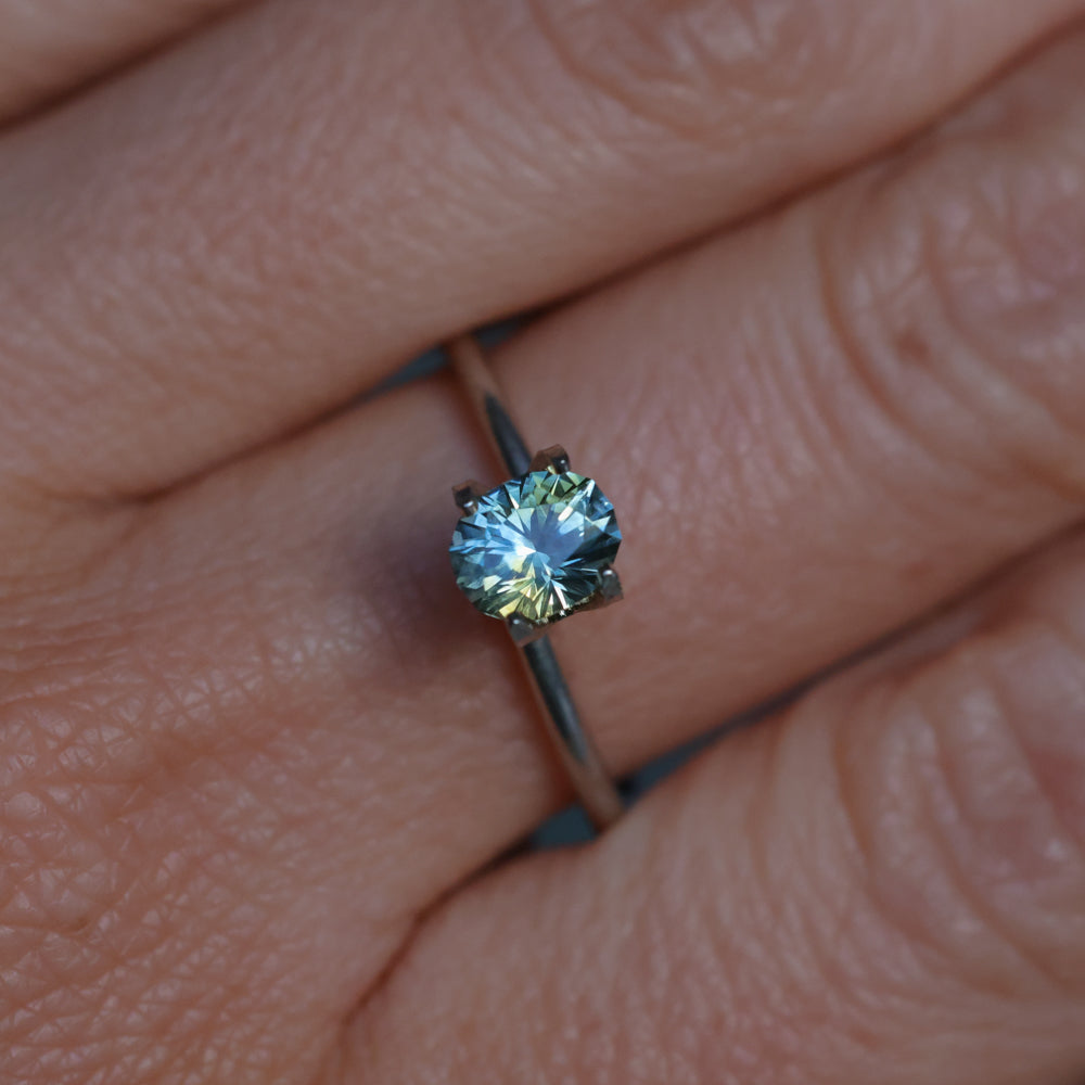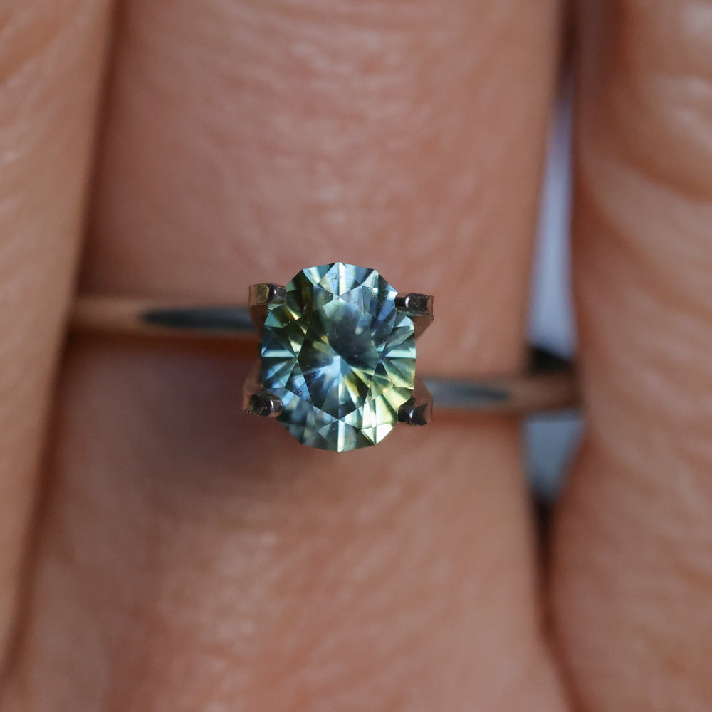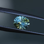 0.86CT PRECISION CUT OVAL MONTANA SAPPHIRE, PARTI YELLOW BLUE, 6.08X4.8X3.7MM. This sapphire was mined in Rock Creek, Montana, USA and cut in the US as well. Lighter blue teal with yellow parti segments! Unusual and fun. Light silk, eye-clean. This sapphire has been heated, a permanent treatment for color and clarity.