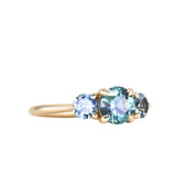 Low profile, minimalist and classic three stone Montana sapphire ring featuring a vibrant center teal, unheated sapphire set in 14k yellow gold.