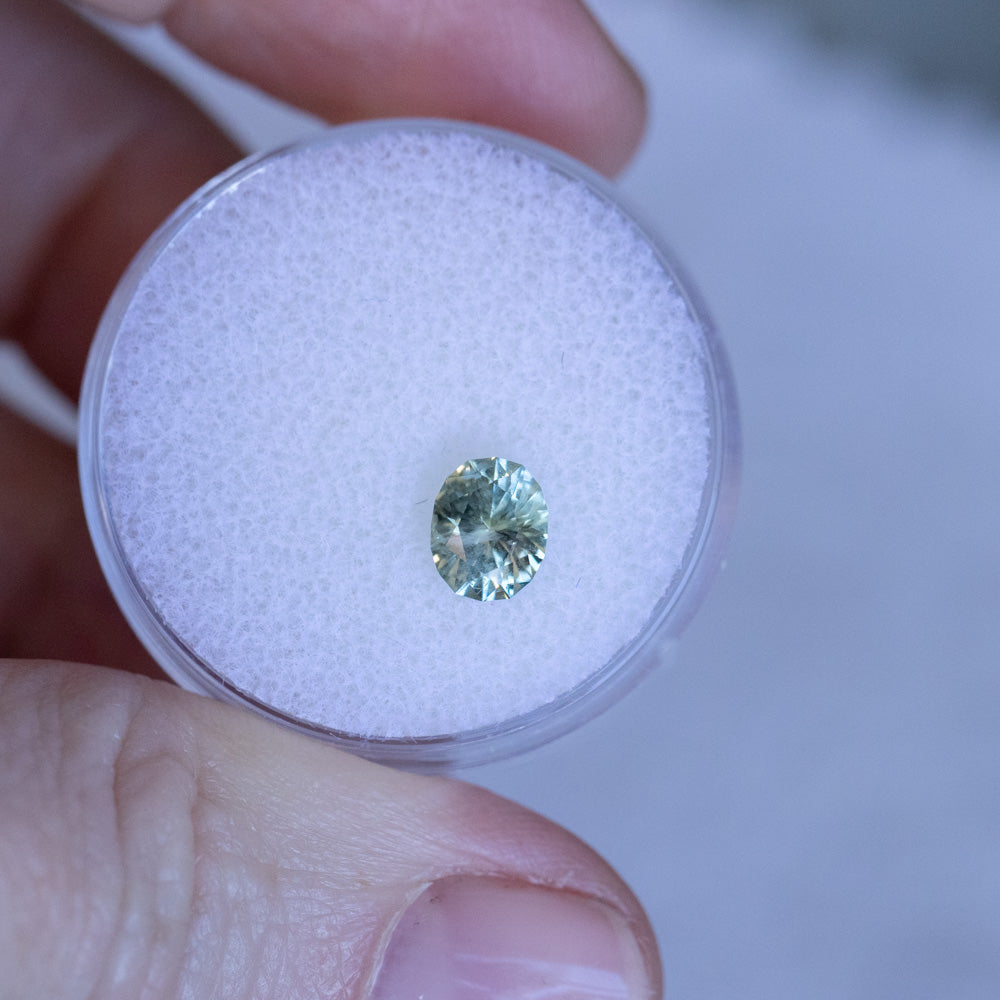 1.04CT PRECISION CUT OVAL MONTANA SAPPHIRE, MINTY LIGHT GREEN YELLOW, 6X5MM