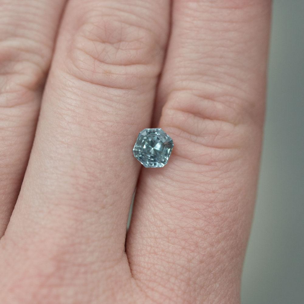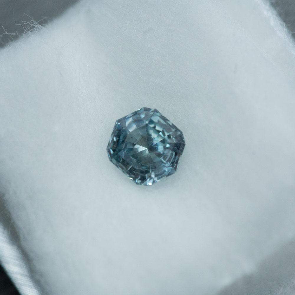 1.05CT HEXAGON MONTANA SAPPHIRE, SKY BLUE TEAL, 6.27X5.49MM. Such a fun, unconventional shape! We're getting more requests for hexagons. This sapphire is totally natural/untreated and was cut by hand by one of our favorite gemstone cutters. The clarity is very good, eye-clean from a regular distance. This is a sparkling, lively stone.