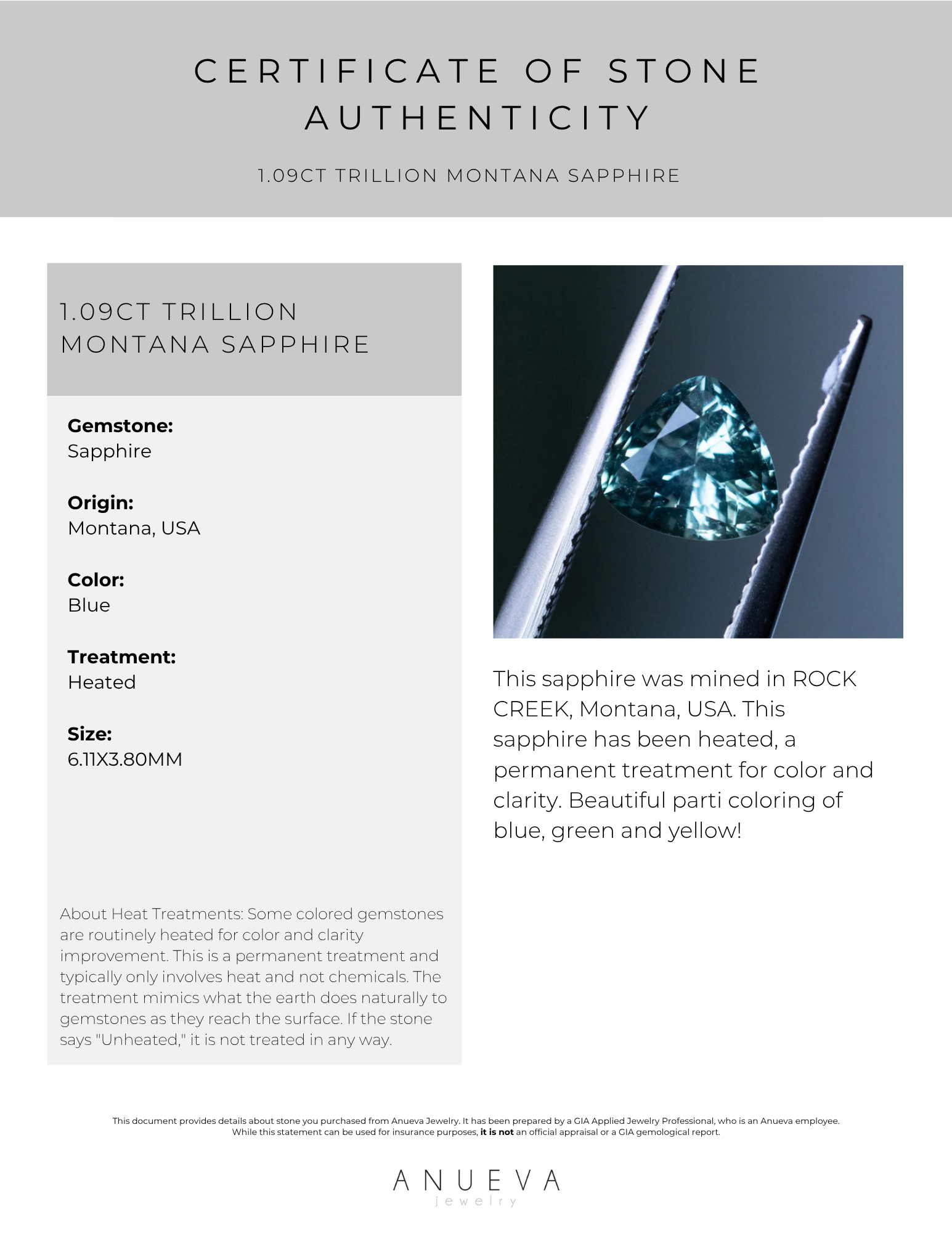 1.09CT TRILLION MONTANA SAPPHIRE, BLUE, 6.11X3.80MM, HEATED. This sapphire was mined in ROCK CREEK, Montana, USA. This sapphire has been heated, a permanent treatment for color and clarity. Beautiful parti coloring of blue, green and yellow!
