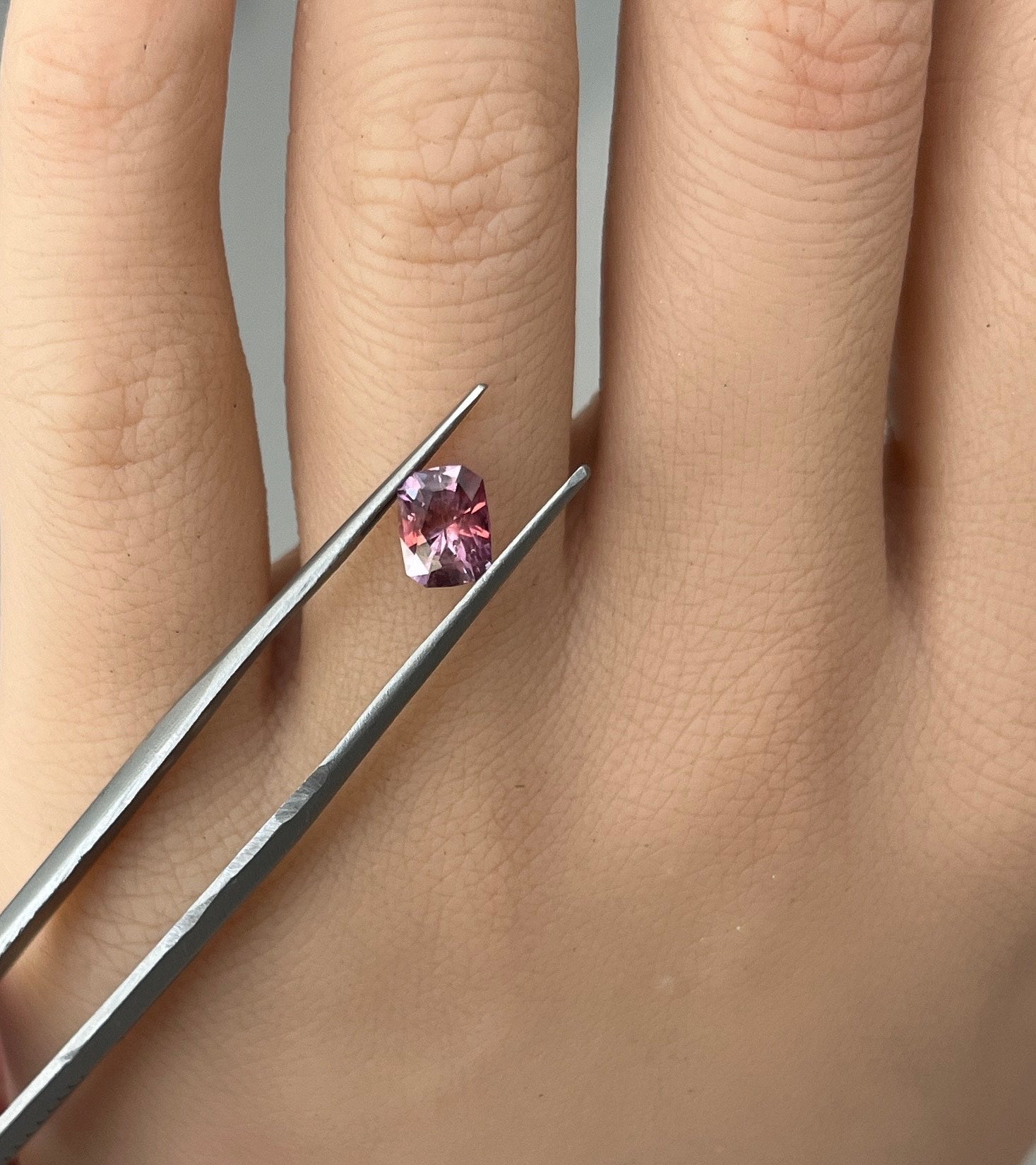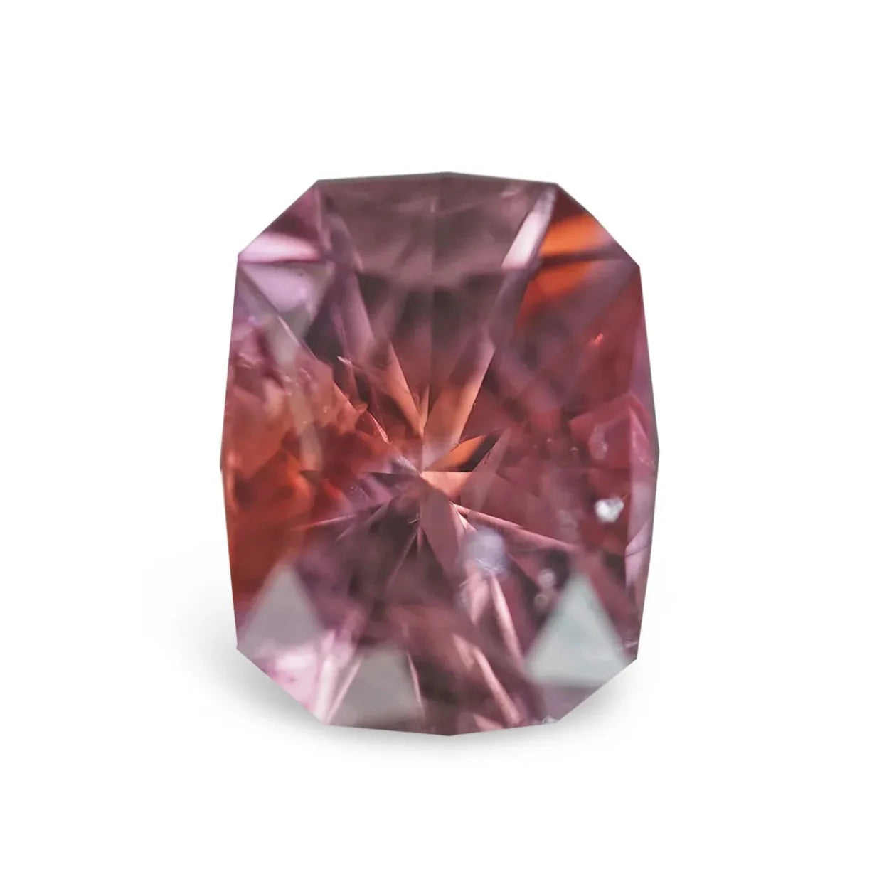 1.00CT FANCY ELONGATED CUSHION MONTANA SAPPHIRE, BI COLOR PINK AND RED, 6.8X5.2MM. A diamond-like precision round brilliant cut, some visible silky clarity. Rare, raspberry pink and red. Mined in Rock Creek, Montana USA. This sapphire has been heated, a permanent treatment for color and clarity. Will darken up indoors and glow in the sun.