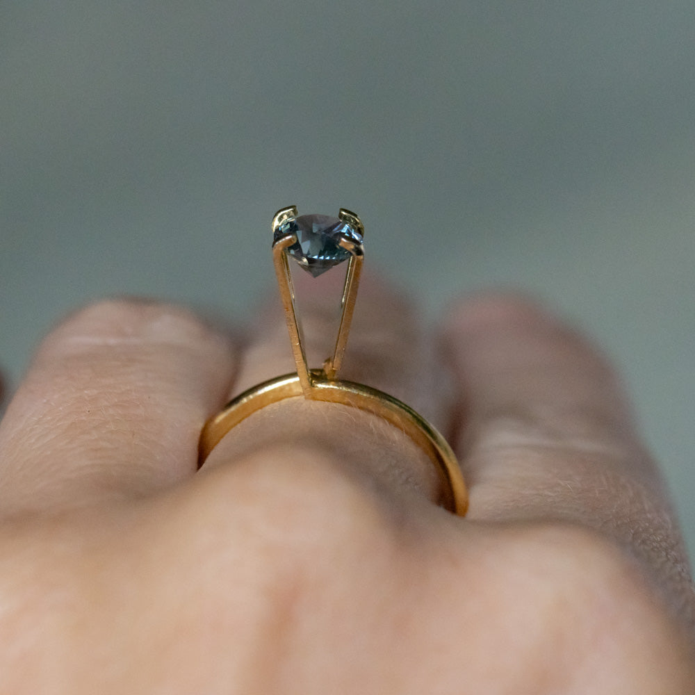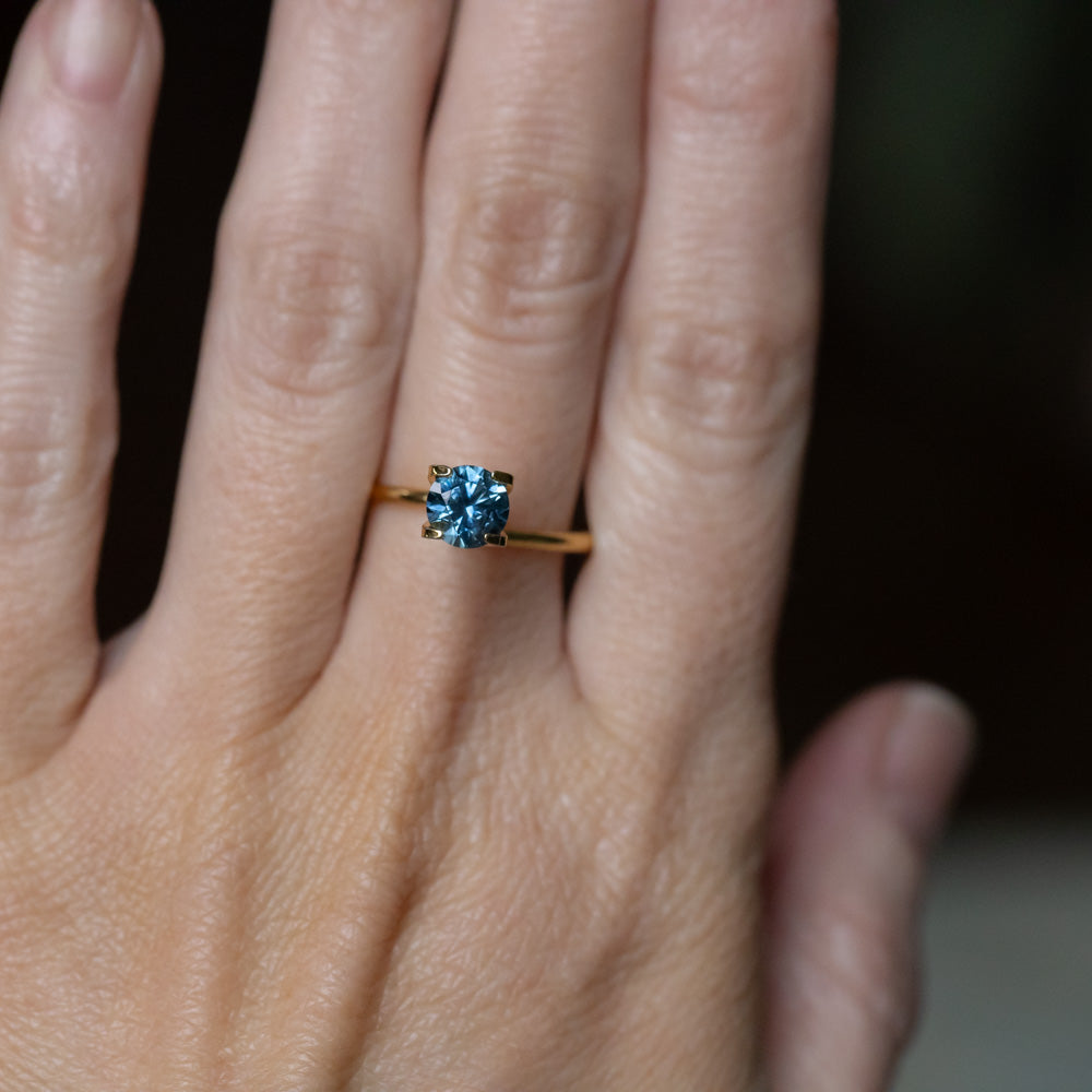 1.14CT ROUND PRECISION CUT MONTANA SAPPHIRE, OCEAN BLUE WITH SOME PURPLE COLOR SHIFTING, 6X4MM. Mined in Rock Creek, Montana, USA, this sapphire has been given a precision, diamond-like cut for a modern look and maximum sparkle! It's a very clean stone, eye-clean to the naked eye. The sapphire will brighten up a vibrant ocean blue teal with some hints of Ceylon in natural light and darken to purple-grey indoors.