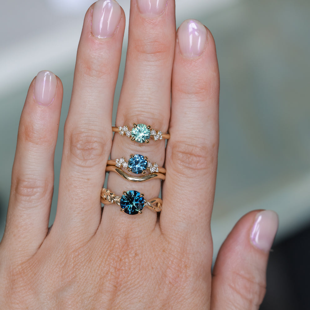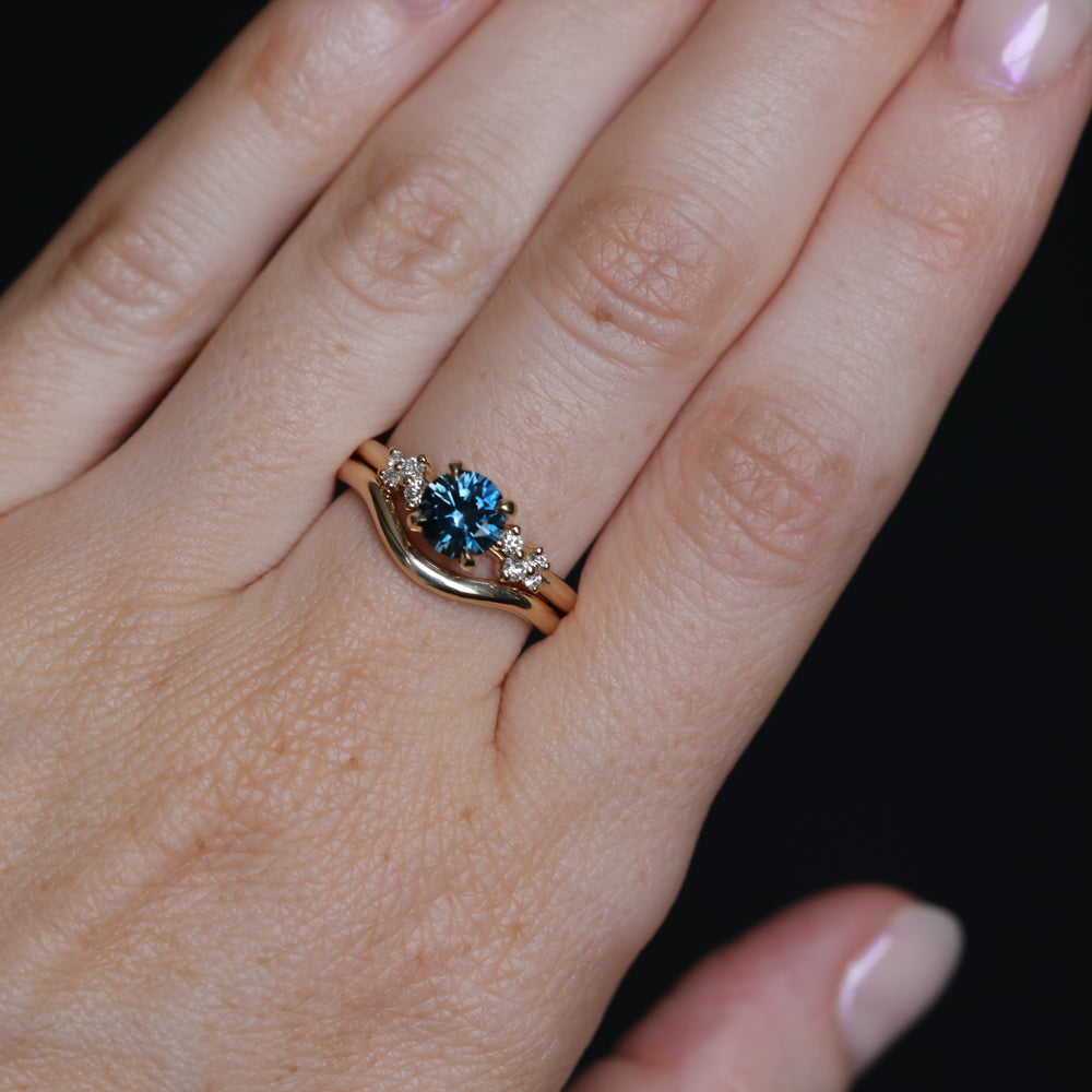 Low profile blue Montana sapphire and diamond ring! We have set our new Starry Night low profile solitaire with a precision cut round 1.16ct Montana sapphire, mined in Rock Creek. This setting sits low to the hand and would pair best with curved or contour bands like our Waterfall Band and Curved Contour Evergreen band.