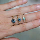 Low profile seafoam blue-green Montana sapphire and diamond ring! We have set our new Starry Night low profile solitaire with a precision cut round 1.21ct unheated Montana sapphire, mined in Ruby Creek. This setting sits low to the hand and would pair best with curved or contour bands like our Waterfall Band and Curved Contour Evergreen band.