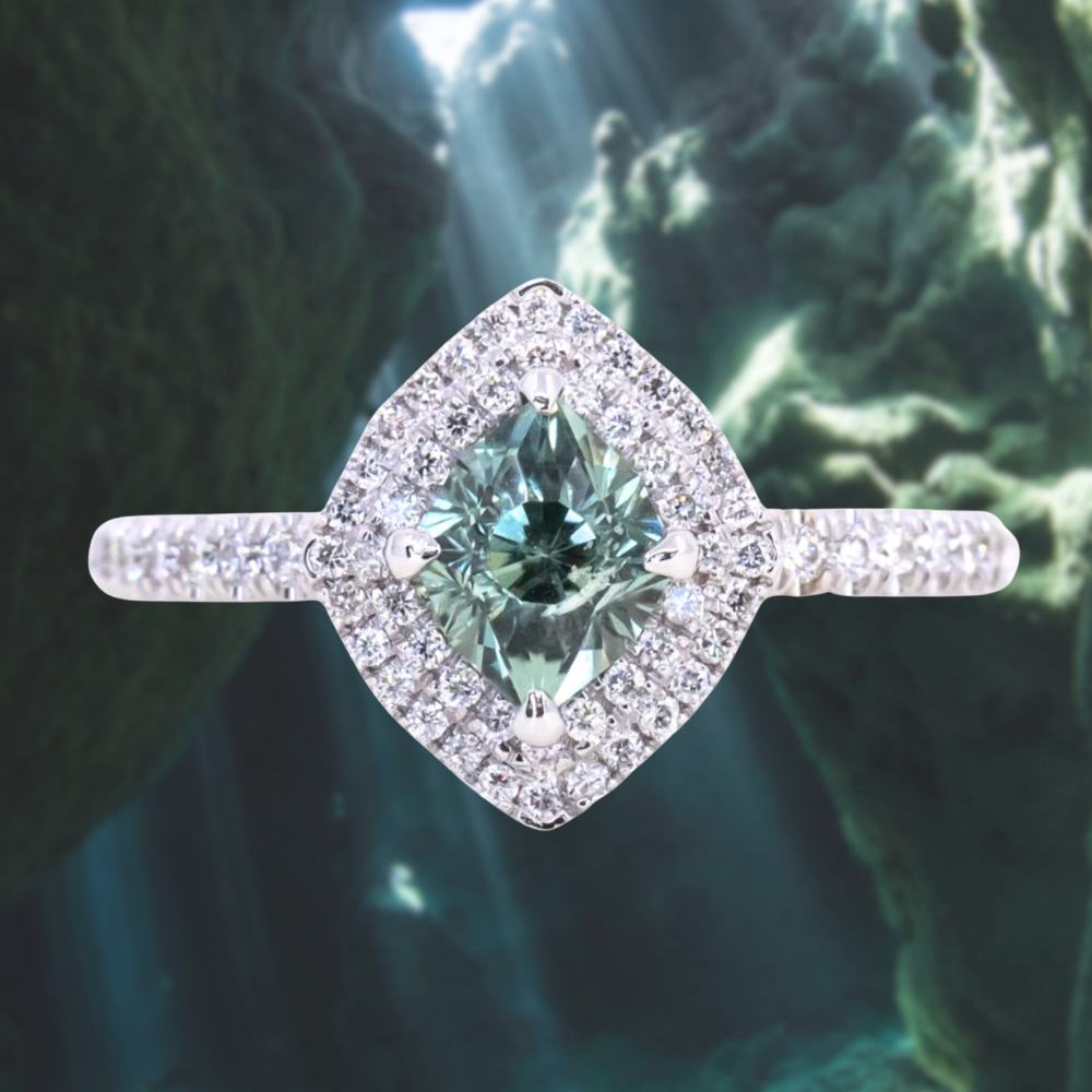 This exquisite 1.23ct, geometric eye-cut Montana sapphire is set in a timeless double diamond halo and finished with a platinum band. The center stone was hand-cut by stone cutter prodigy Nadine Marshall! This statement or engagement ring sits low profile and pairs excellently with a custom fitted or curved wedding band for a truly unique look.