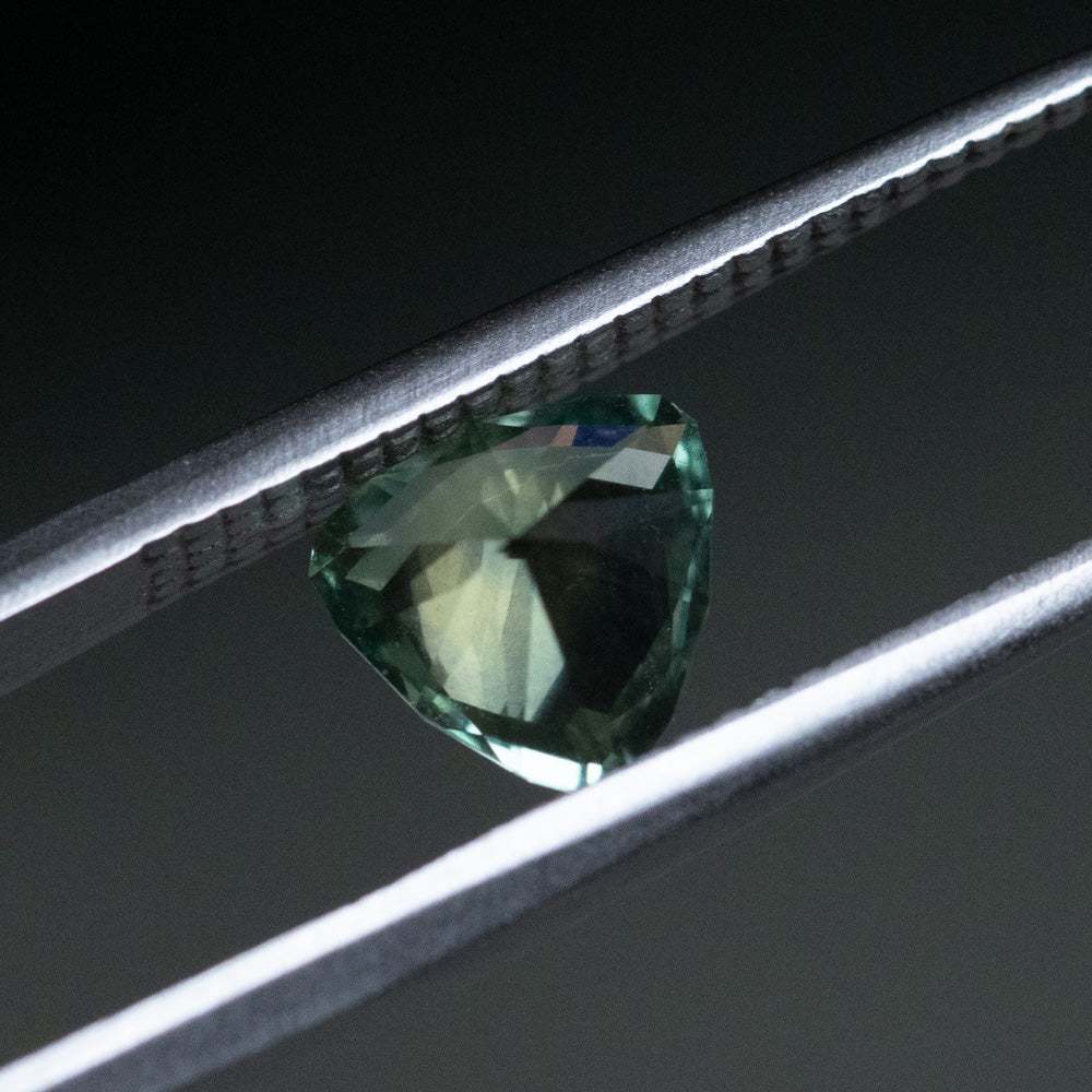 1.25CT TRILLION MONTANA SAPPHIRE, BRIGHT SPRING GREEN WITH YELLOW, 6.8MM. This sapphire was mined in Rock Creek, Montana, USA and precision cut for the best sparkle! Rare, bright green with teal and yellow flashes. Great clarity.