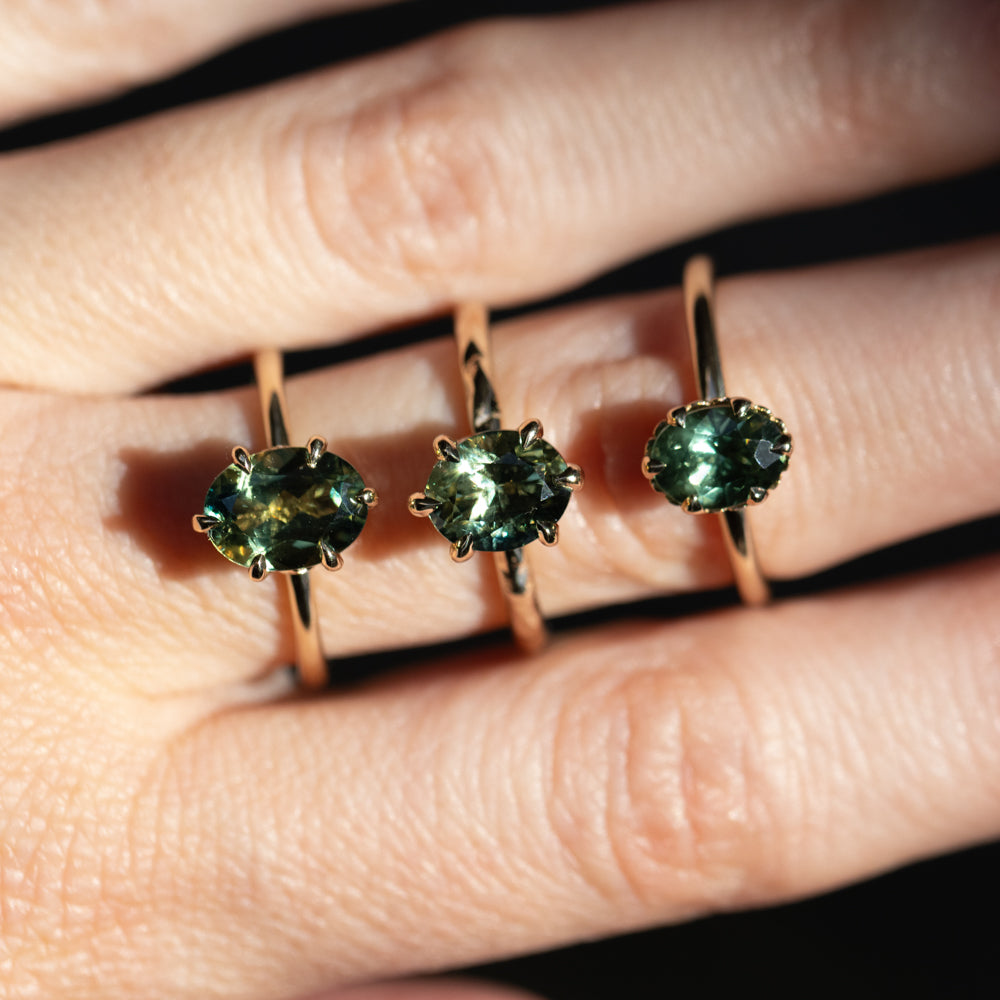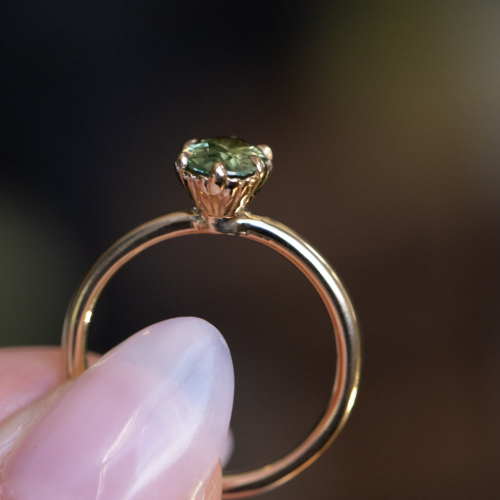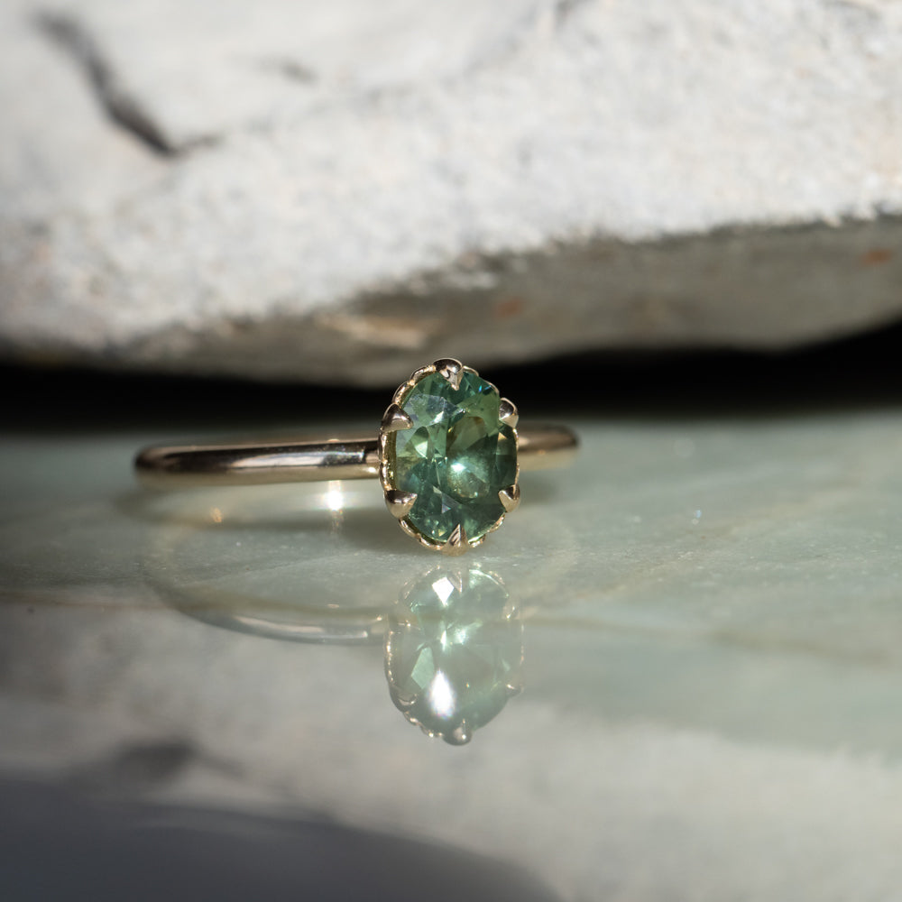 1.34ct Oval Teal Green Montana Sapphire Scallop Cup Solitaire in 14k Yellow Gold