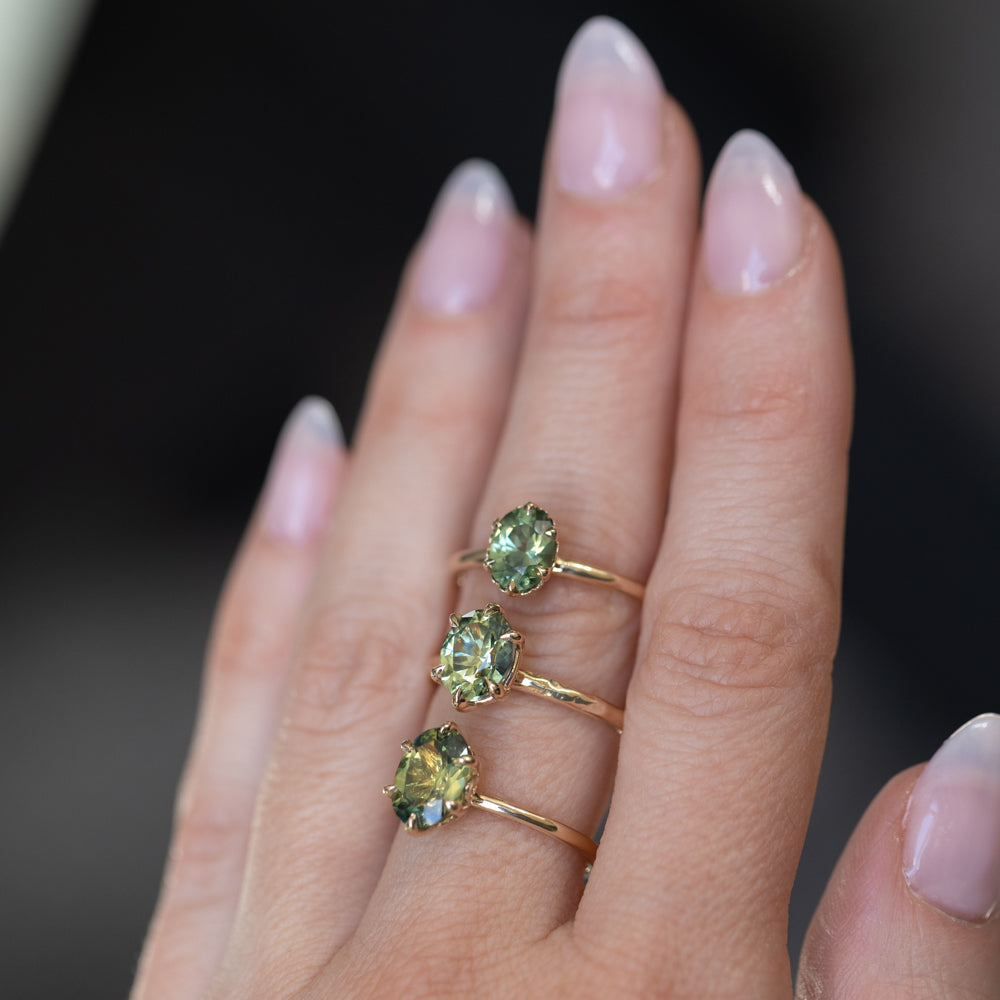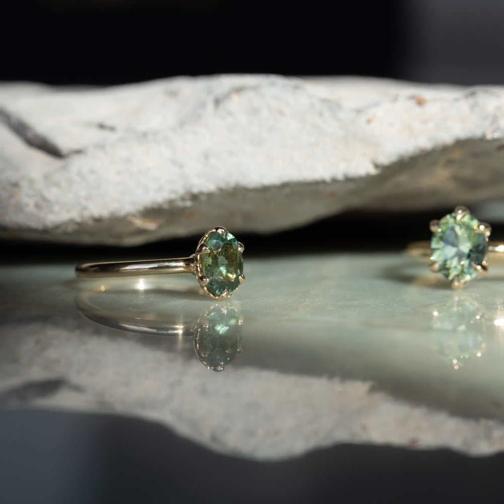 Combining timeless elegance with a touch of sea-inspired charm, our Scallop Cup Solitaire is a one-of-a-kind ring! It features a weighty, 14k recycled yellow gold band with a classic, rounded shank and polished finish. This specific Scallop Cup Solitaire features an in-demand teal green Montana sapphire from Missouri River, USA.