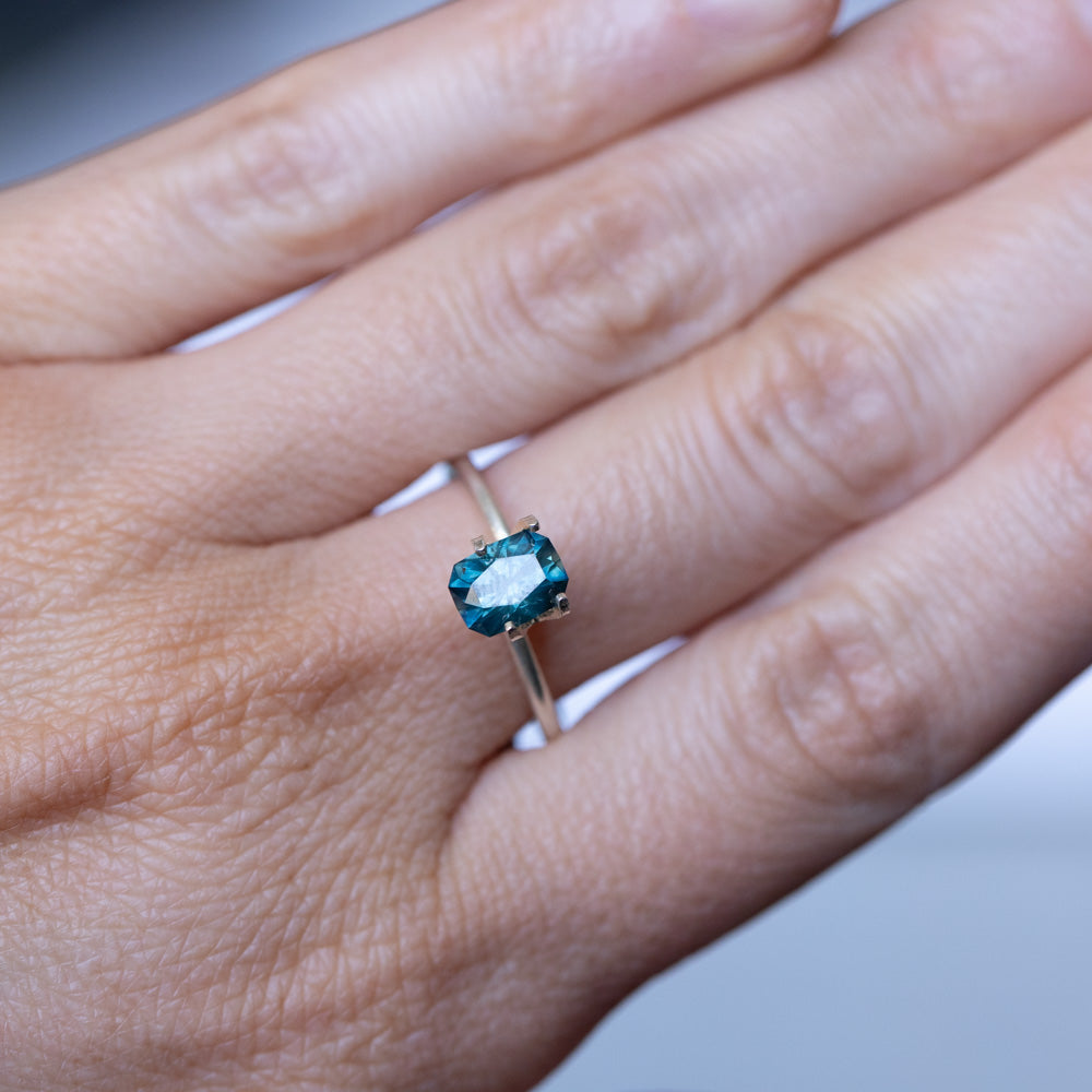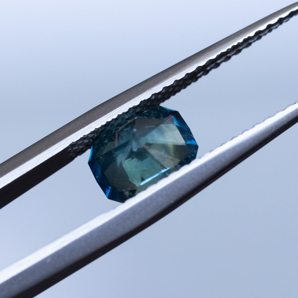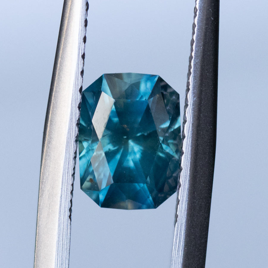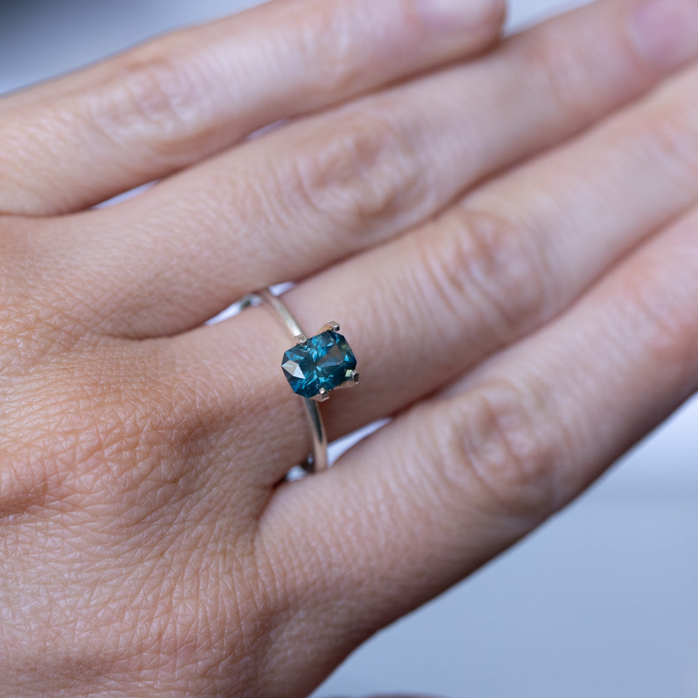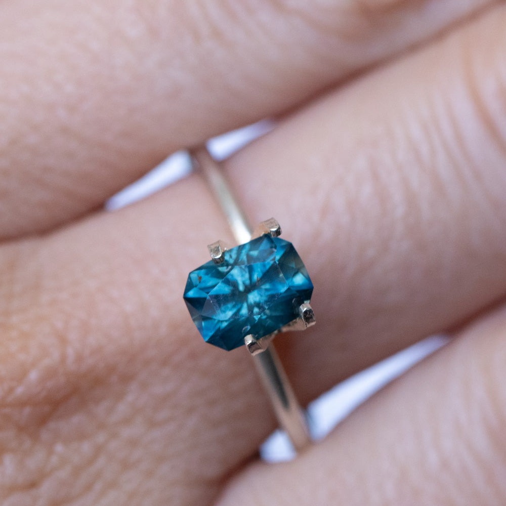 1.34CT RADIANT PRECISION CUT MONTANA SAPPHIRE, DARK TEAL BLUE, 6.76X5.18X4.28MM. This sapphire was mined in Rock Creek, Montana, USA and has minor silk inclusions. This sapphire has been heated, a permanent treatment for color and clarity. Will shift in color from more vibrant blue teal in natural light and more greenish-grey teal indoors. Precision cut for sparkle in a faceted radiant brilliant cut.