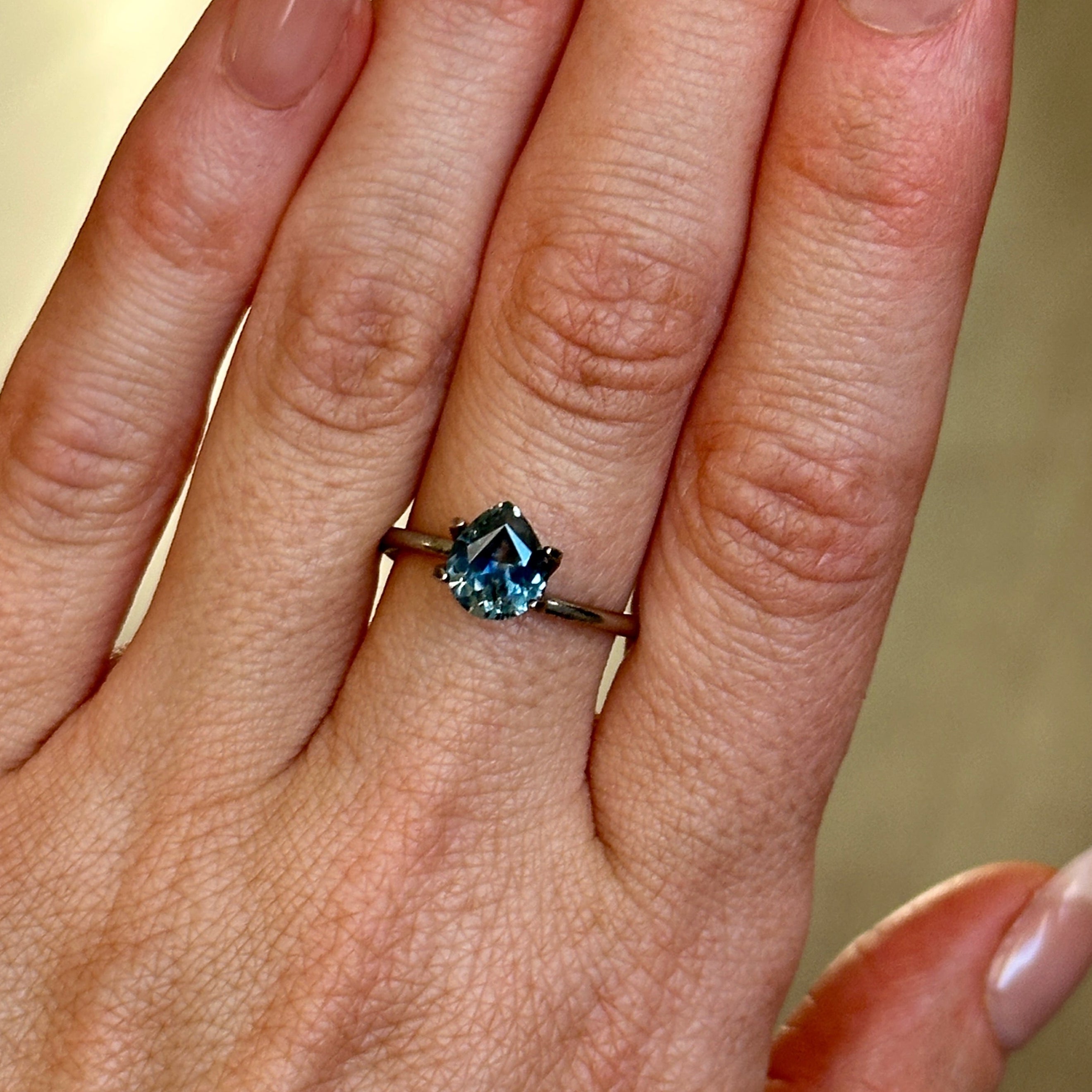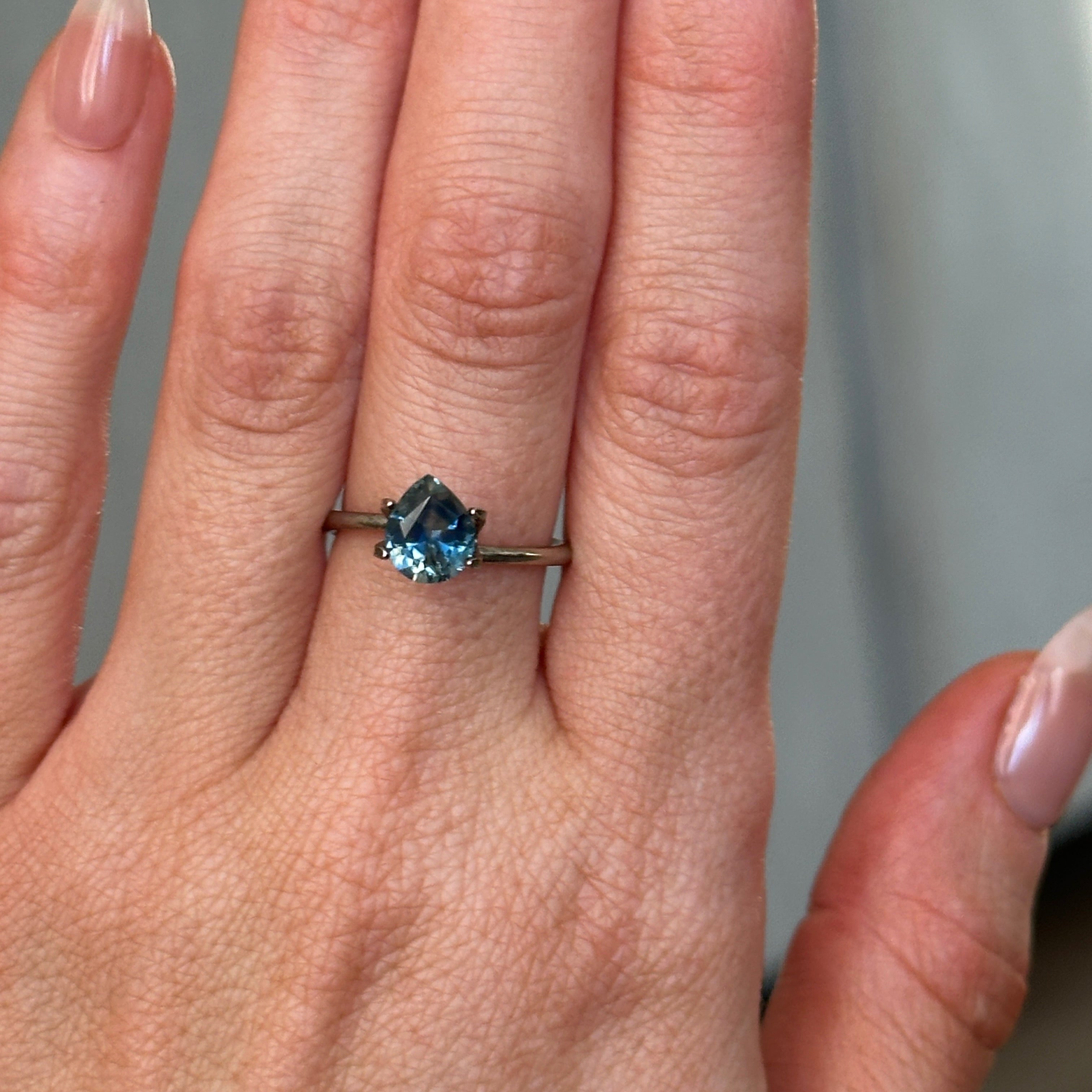 1.36CT PEAR MONTANA SAPPHIRE, PARTI BLUE WHITE, 7.76X6.42X3.89MM, UNTREATED. This sapphire is mined in El Dorado Bar, Montana, USA, Parti blue to white/gradient coloring with some visible white inclusions at the tip. Doesn't take away from the beauty of this natural stone!