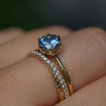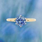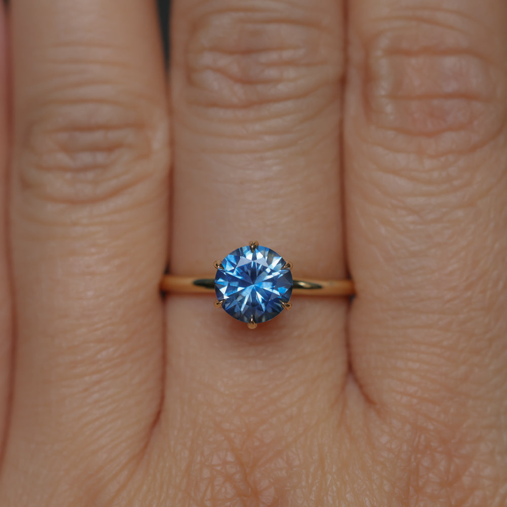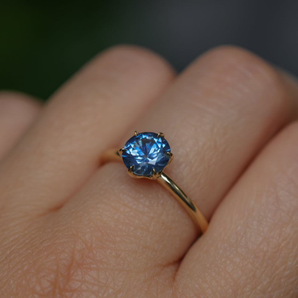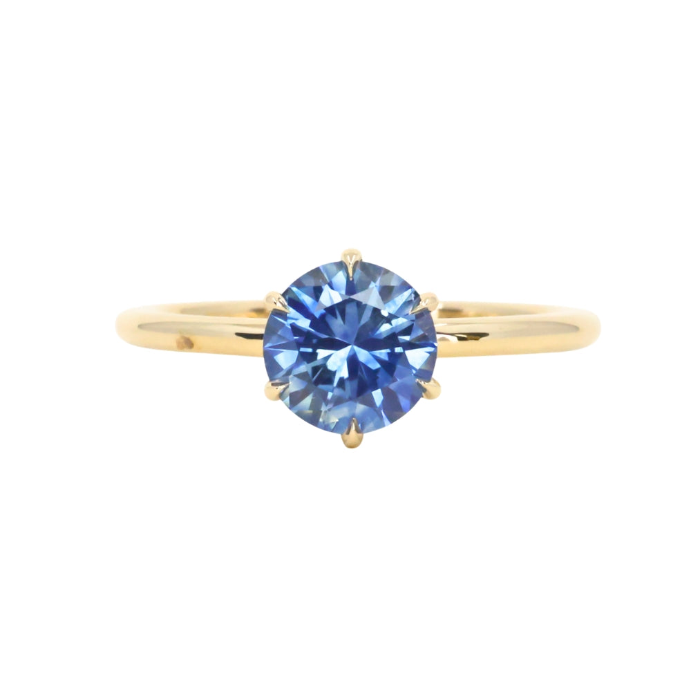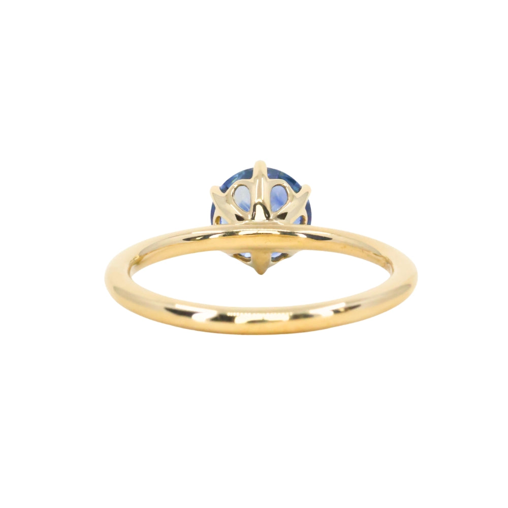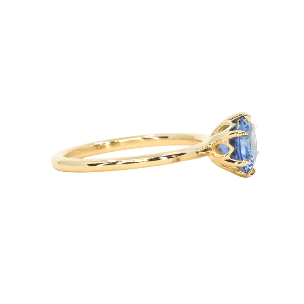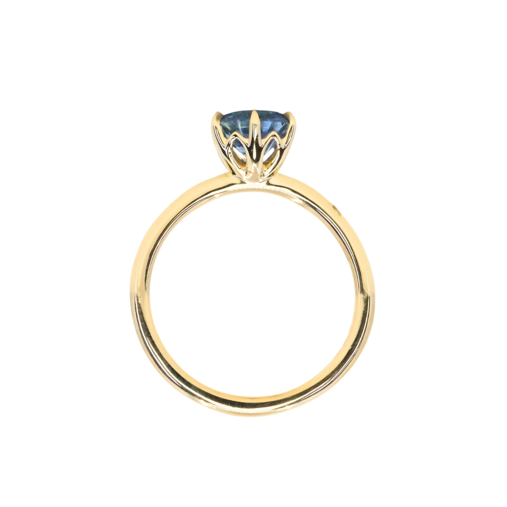 Enjoy romantic flair with the Lotus solitaire. Cast from recycled 18k yellow gold, the band is rounded, smooth, and plain. We've set a US-mined 1.37ct round brilliant precision cut Montana Sapphire in this setting with a traditional Ceylon blue hue.