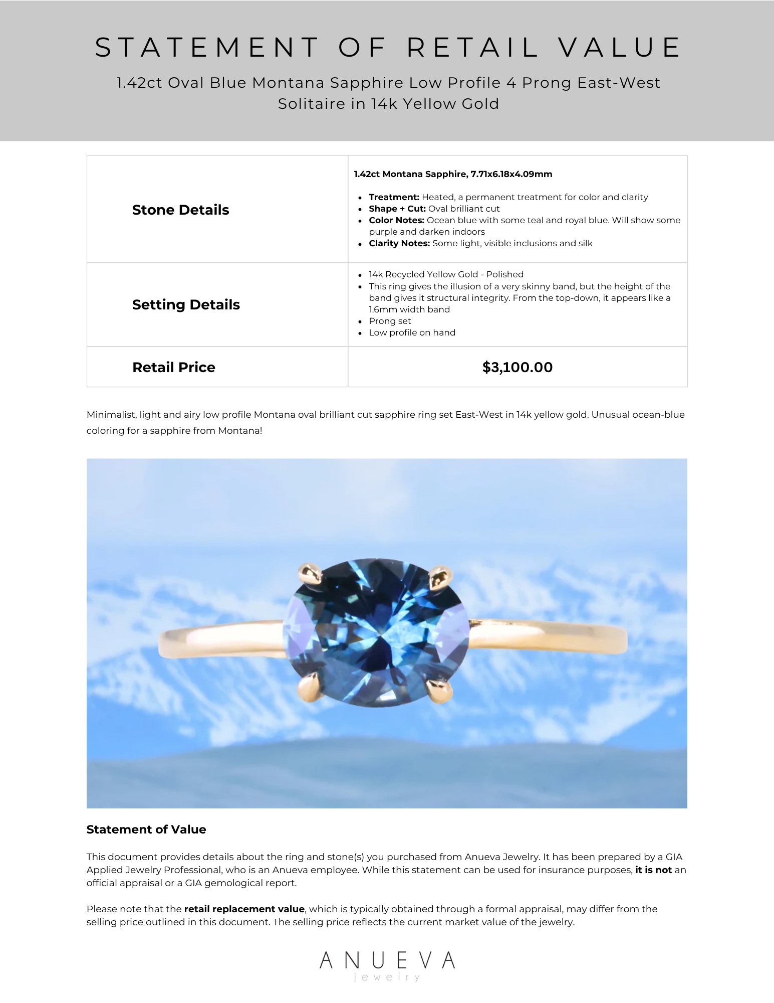 1.42ct Oval Blue Montana Sapphire Low Profile 4 Prong East-West Solitaire in 14k Yellow Gold