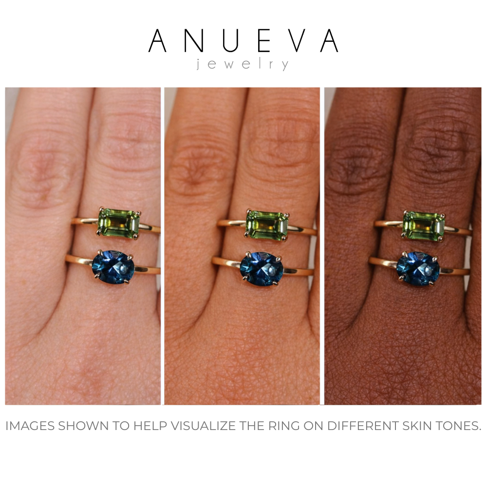 Minimalist, light and airy low profile Montana oval brilliant cut sapphire ring set East-West in 14k yellow gold. Unusual ocean-blue coloring for a sapphire from Montana!