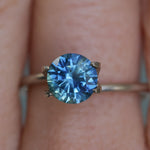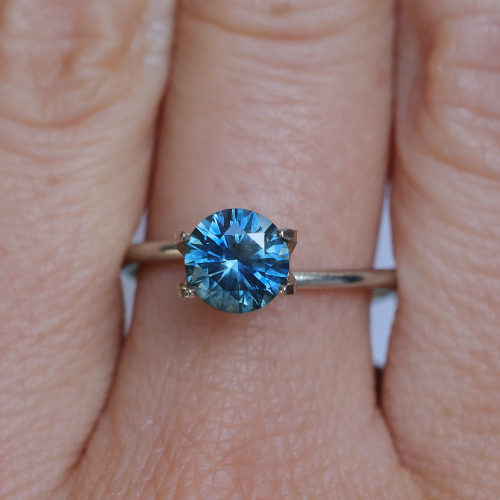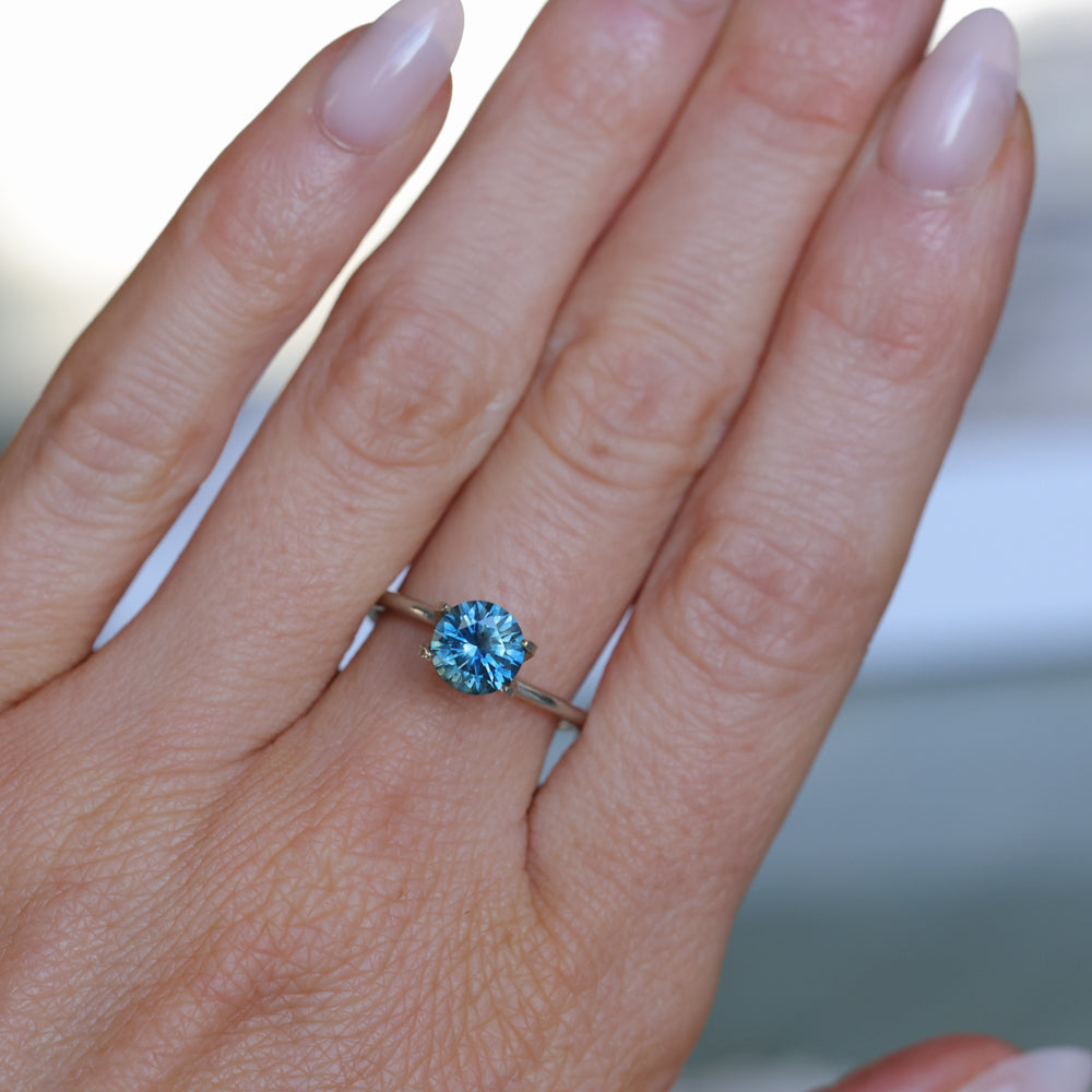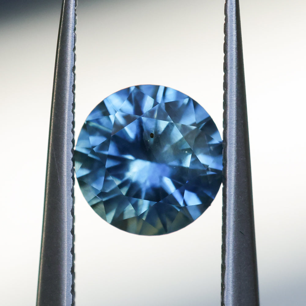 1.42CT ROUND PRECISION CUT MONTANA SAPPHIRE, OCEAN BLUE TEAL, 6.7X4.36MM. Gorgeous round brilliant precision cut with visible silk cloud under the table of this stone, more visible from certain angles. This sapphire has been heated, a permanent treatment for color and clarity. Will appear more teal blue in natural light and more teal green grey indoors.