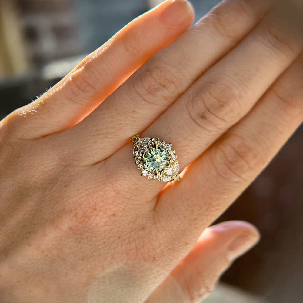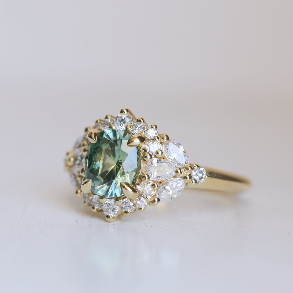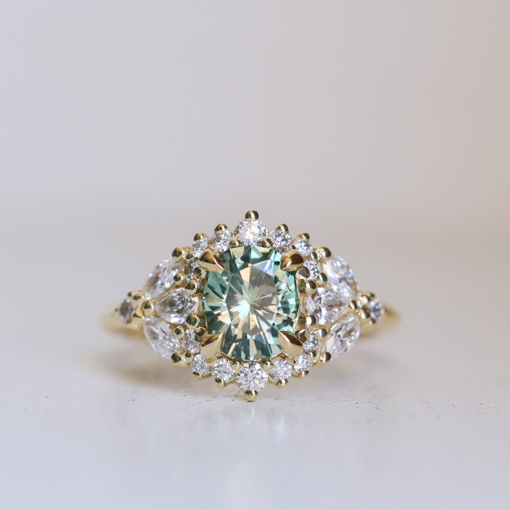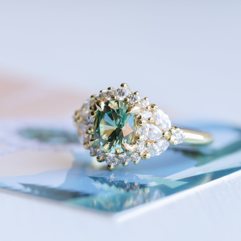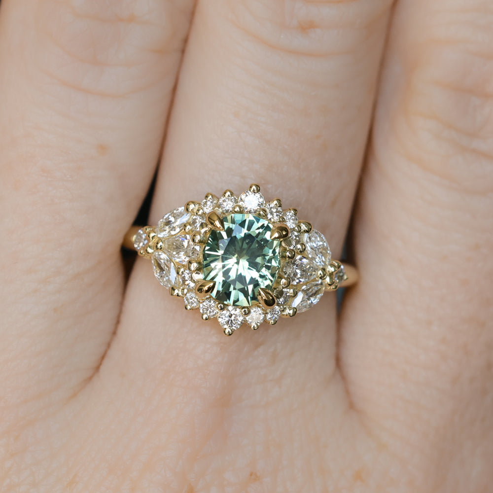 New Diamond Floral Halo makes her debut! At the center of this sparkling, feminine diamond and 18k yellow gold design is a medium teal blue green precision cut elongated cushion Montana sapphire, mined in Rock Creek, USA.