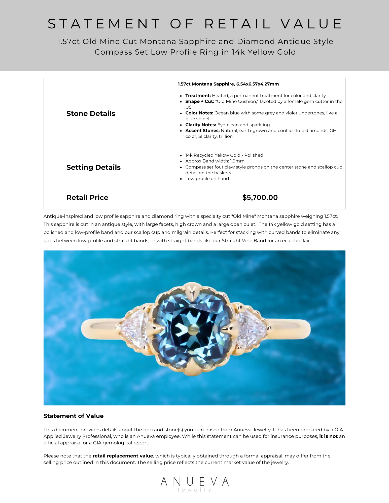 - Shape + Cut: "Old Mine Cushion," faceted by a female gem cutter in the US