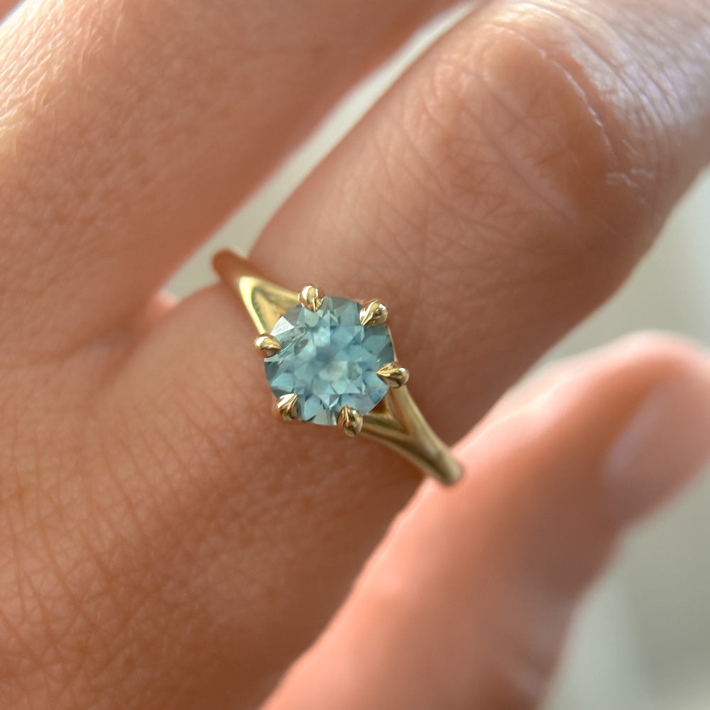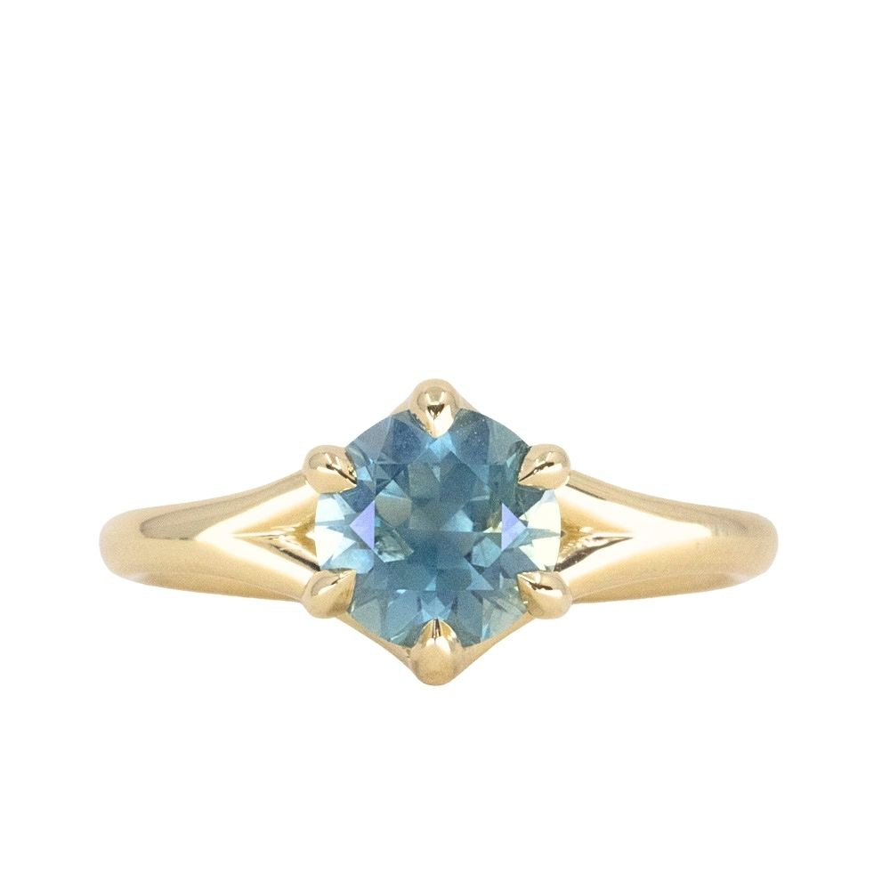 1.70ct Unheated Montana Sapphire Low Profile Six Prong Split Shank Solitaire in 18k Yellow Gold