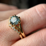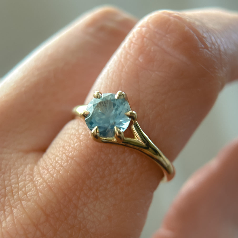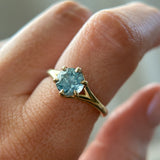 Untreated/totally natural blue sapphire mined in Montana and set in an antique-inspired low profile split shank solitaire with six claw prongs. Easy to wear, protective style.
