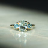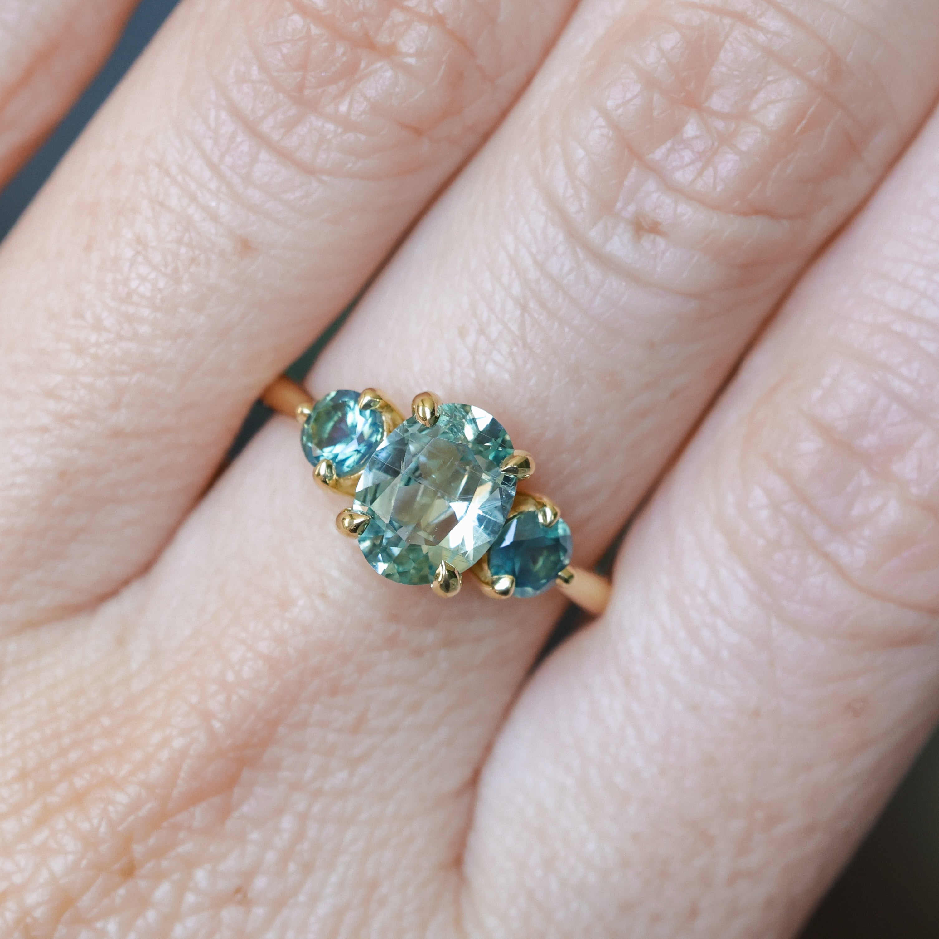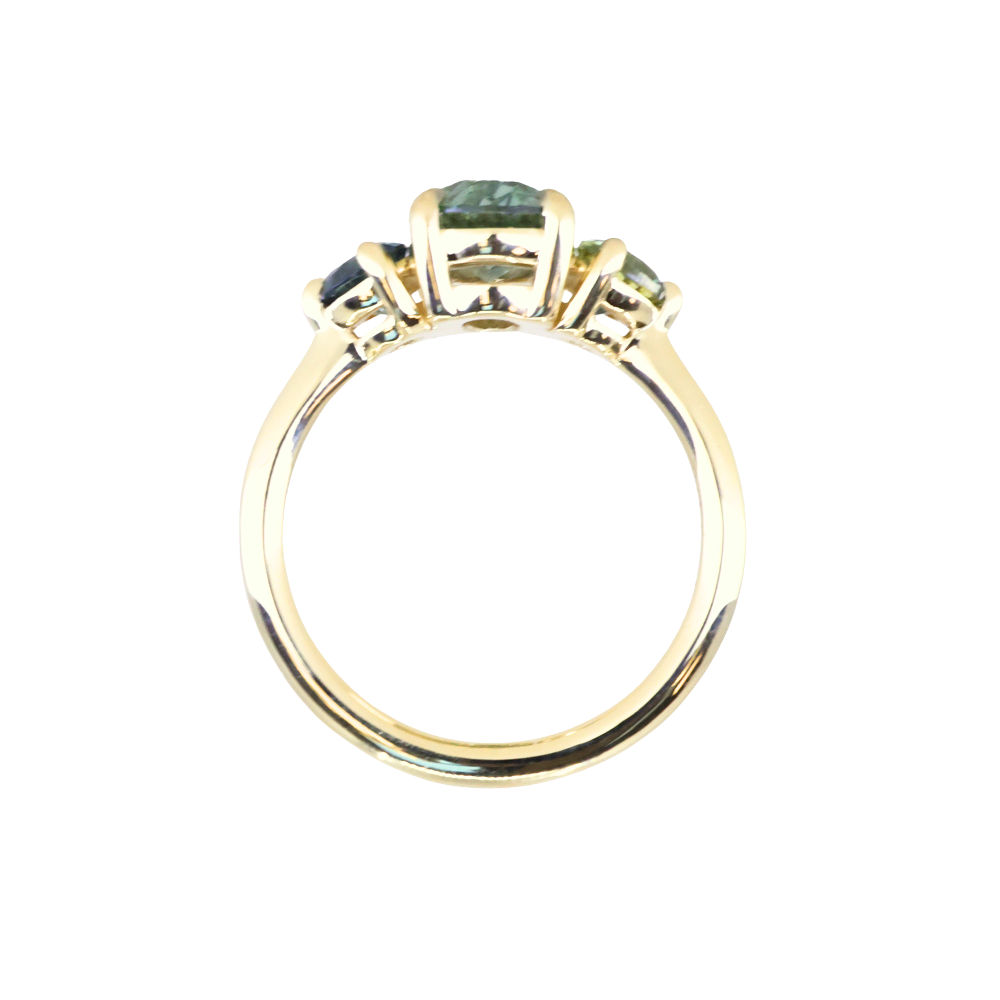 1.74ct Unheated Oval Montana Sapphire and Madagascar Sapphire Low Profile Three Stone Ring in 18k Yellow Gold