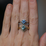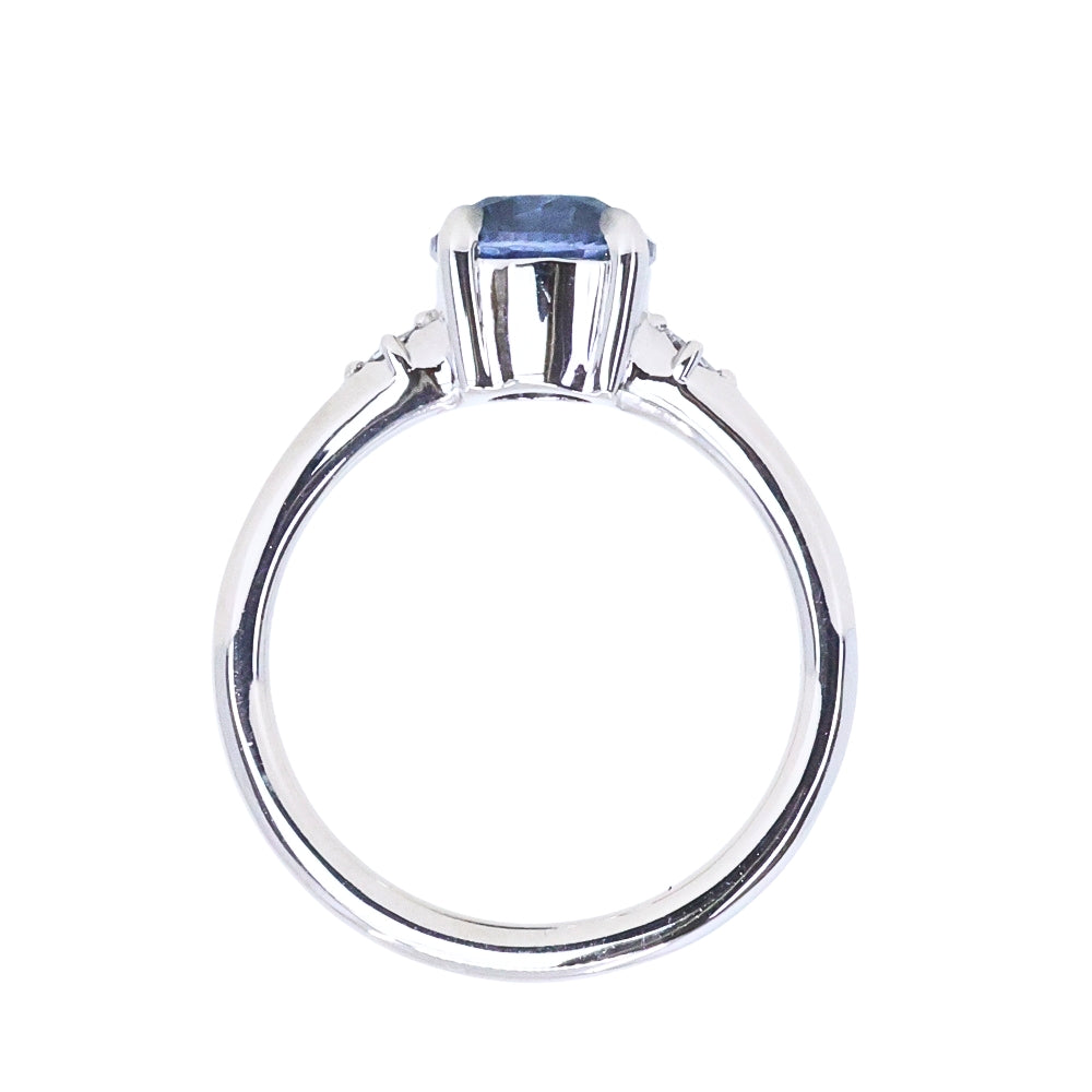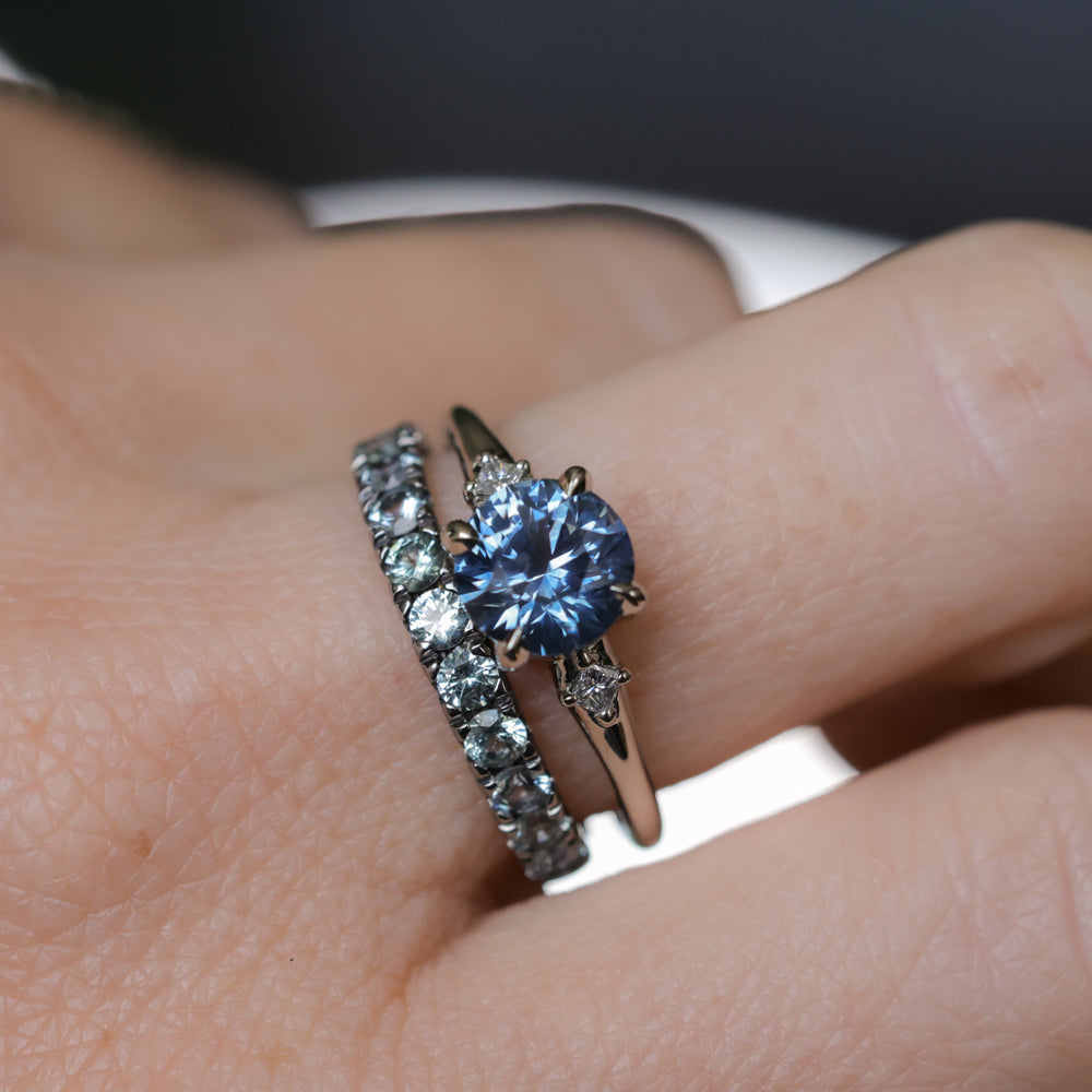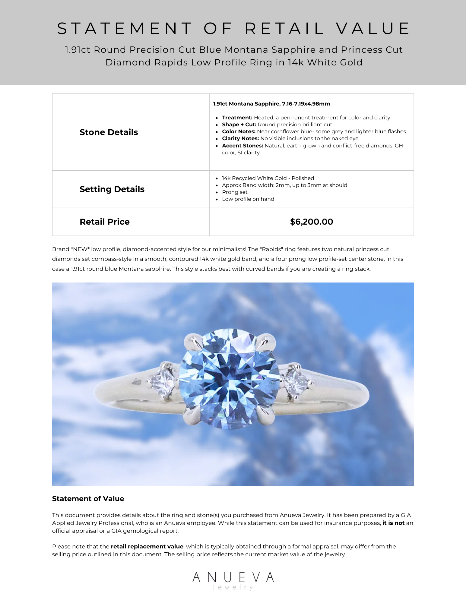 Brand *NEW* low profile, diamond-accented style for our minimalists! The "Rapids" ring features two natural princess cut diamonds set compass-style in a smooth, contoured 14k white gold band, and a four prong low profile-set center stone, in this case a 1.91ct round blue Montana sapphire. This style stacks best with curved bands if you are creating a ring stack.