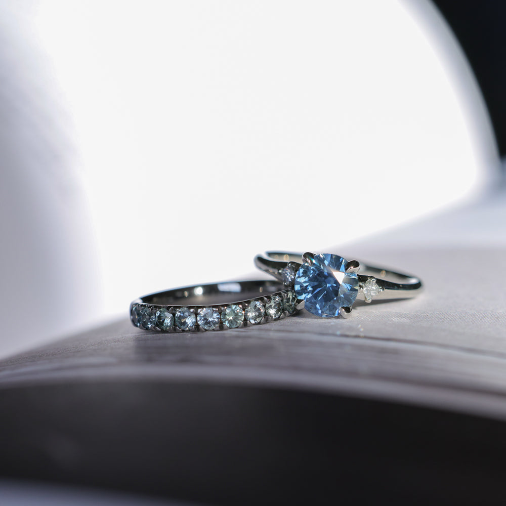 1.91ct Round Precision Cut Blue Montana Sapphire and Princess Cut Diamond Rapids Low Profile Ring in 14k White Gold