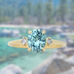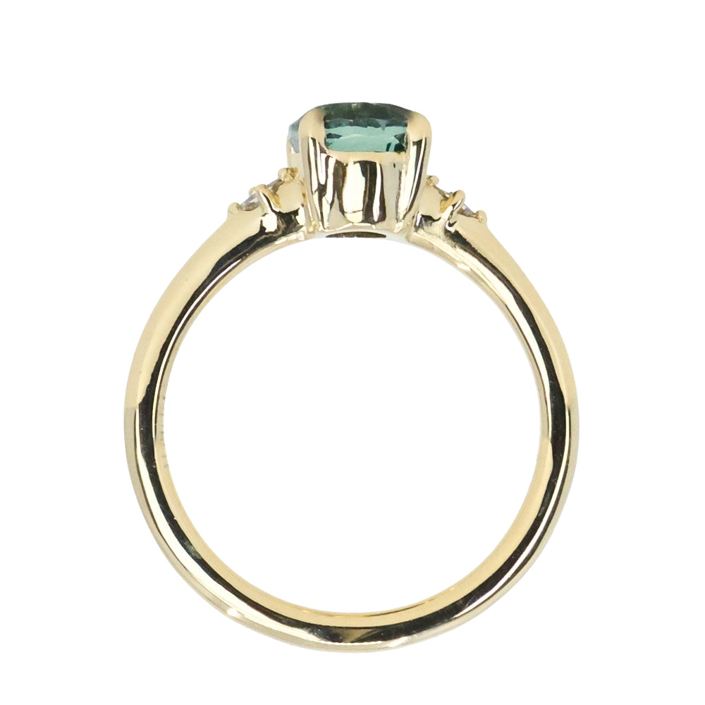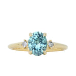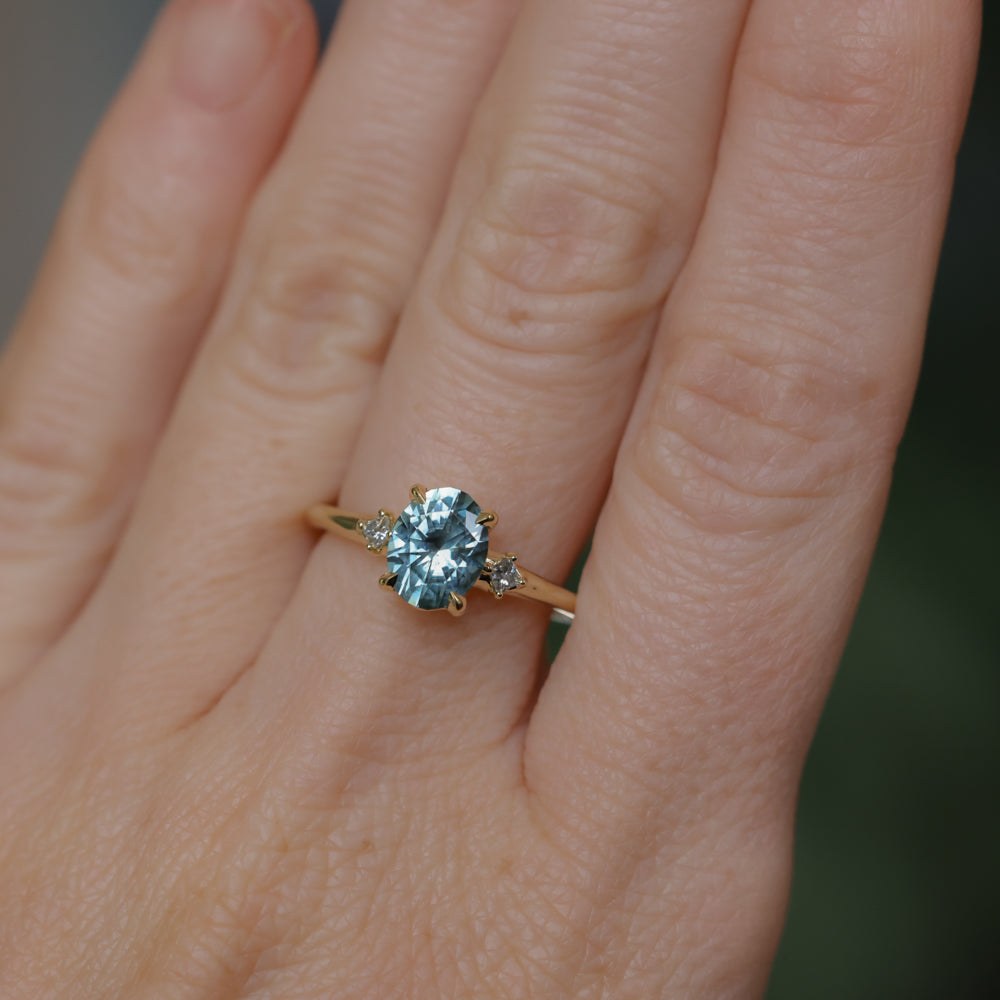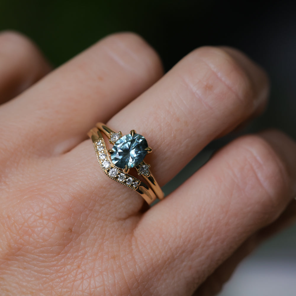 Brand *NEW* low profile, diamond-accented style for our minimalists! The "Rapids" ring features two natural princess cut diamonds set compass-style in a smooth, contoured 18k yellow gold band, and a four prong low profile-set center stone, in this case a 2.01ct oval precision cut light blue Montana sapphire that is totally natural/untreated. This style stacks best with curved bands if you are creating a ring stack.