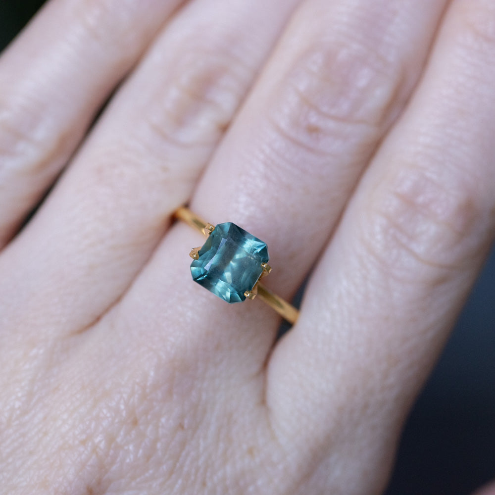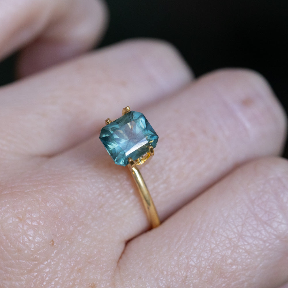 2.46CT RADIANT CUT MONTANA SAPPHIRE, TEAL BLUE GREEN-GREY, 7.71X7.07X5MM, UNTREATED Totally natural/untreated! Mined in Montana, USA. Light, even silk in this stone, common for sapphires from Montana! Rare larger size over 2ct. Can shift in color to more blue in natural light to more blue grey indoors.