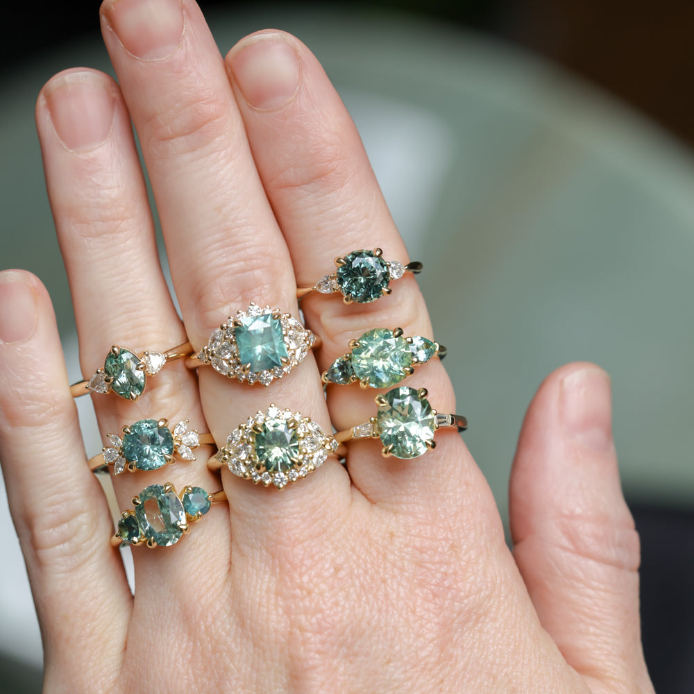 The setting sits low to the hand and would stack with larger/open contour bands, or we can create a stacking band for you to nest if you're wanting to wear this in a wedding stack.