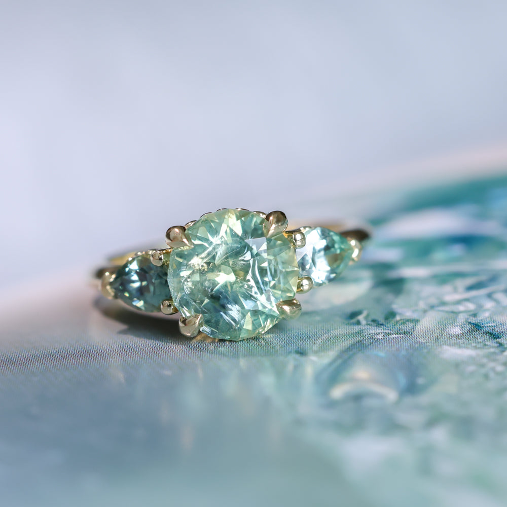 2.75ct Round Untreated Parti Montana Sapphire and Pear Montana Sapphire Three Stone Low Profile Scallop Ring in 18k Yellow Gold