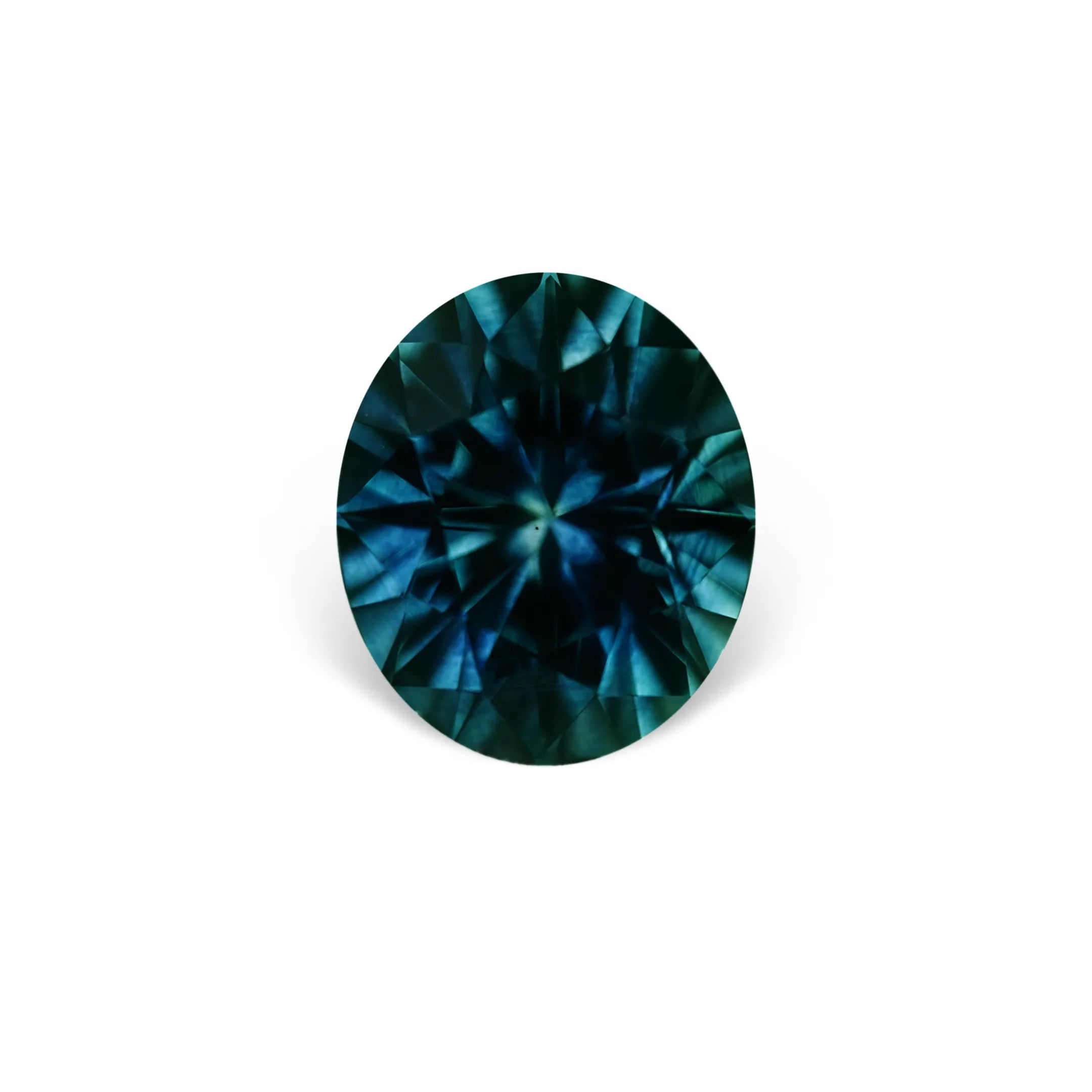 2.96CT OVAL PRECISION CUT MONTANA SAPPHIRE, DEEP TEAL, 8.8X7.6MM. A diamond-like precision oval brilliant cut, slightly included clarity. Mined and faceted in Rock Creek,USA. A very rare, larger size for sapphires from Montana. This sapphire has been heated, a permanent treatment for color and clarity. Will shift in color depending on the light available from more blue to more green.