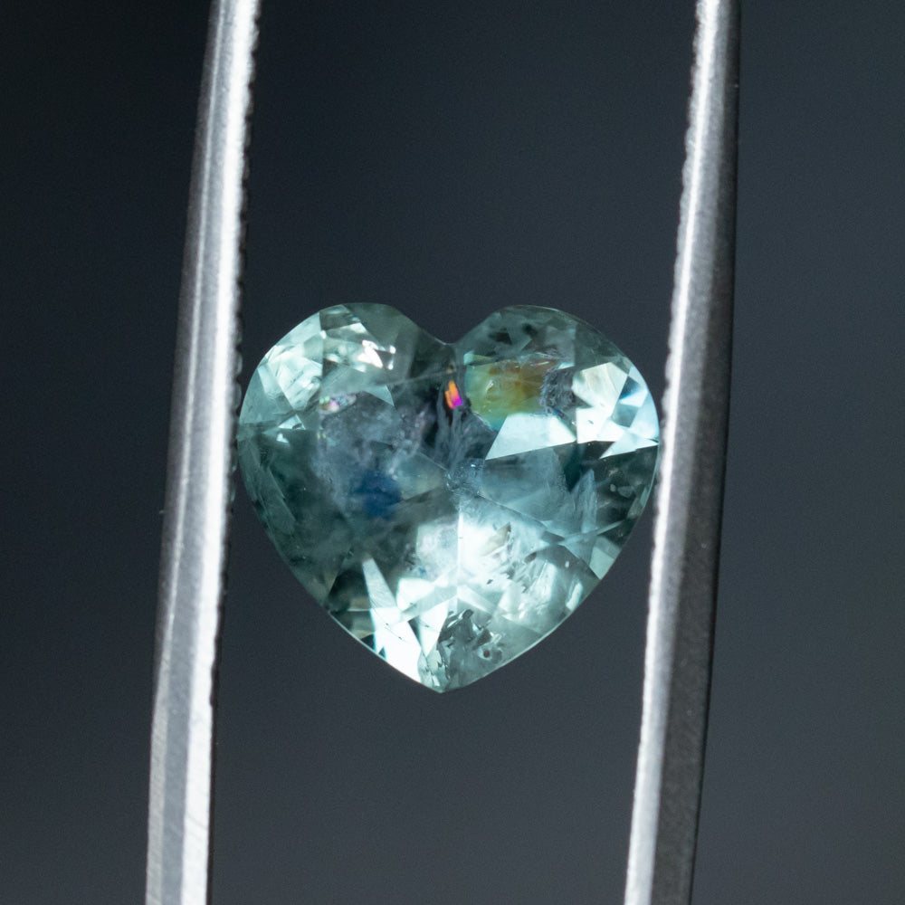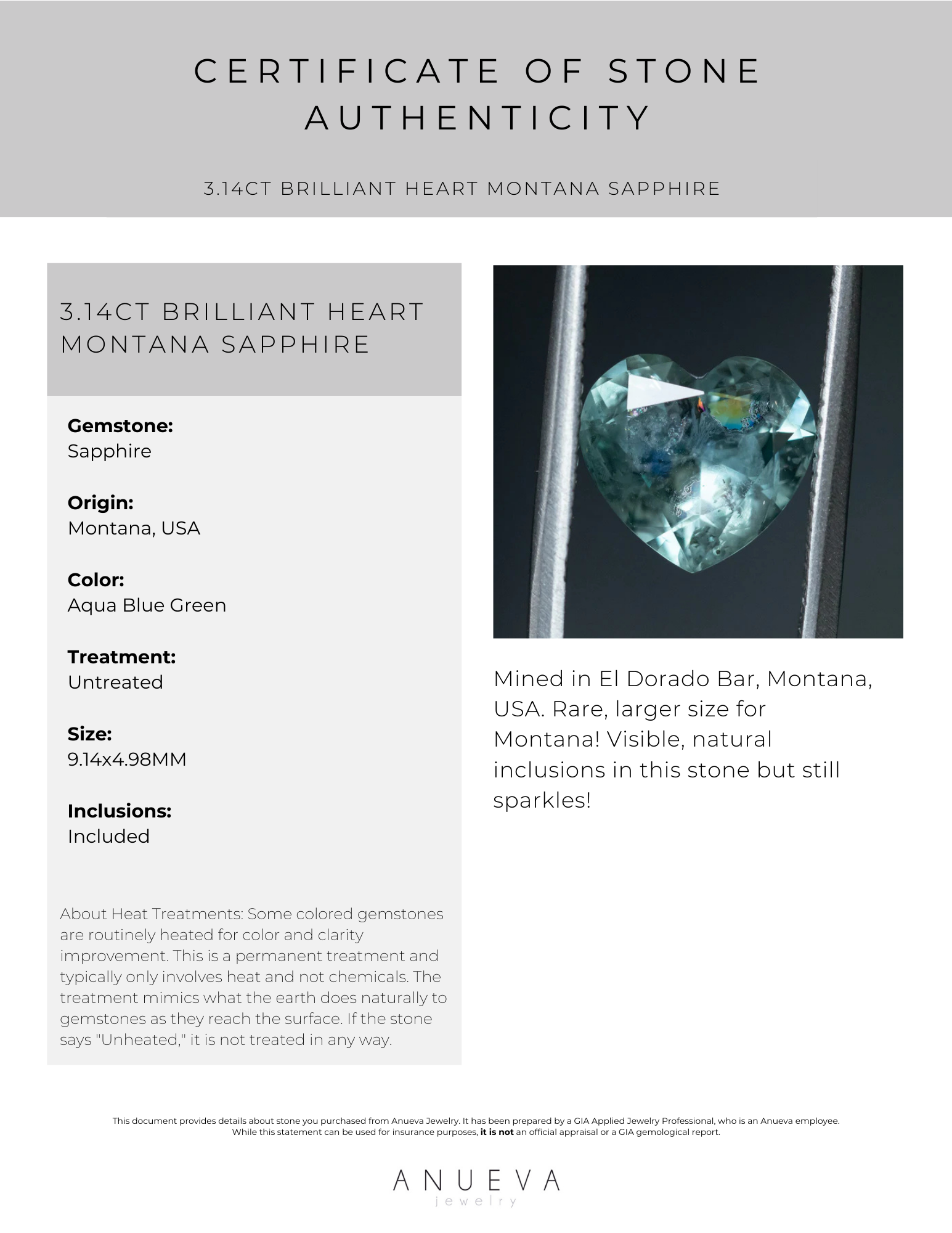 3.14CT BRILLIANT HEART MONTANA SAPPHIRE, AQUA BLUE GREEN, UNTREATED, 9.14X4.98MM, EARLY ACCESS. Mined in El Dorado Bar, Montana, USA. Rare, larger size for Montana! Visible, natural inclusions in this stone but still sparkles!