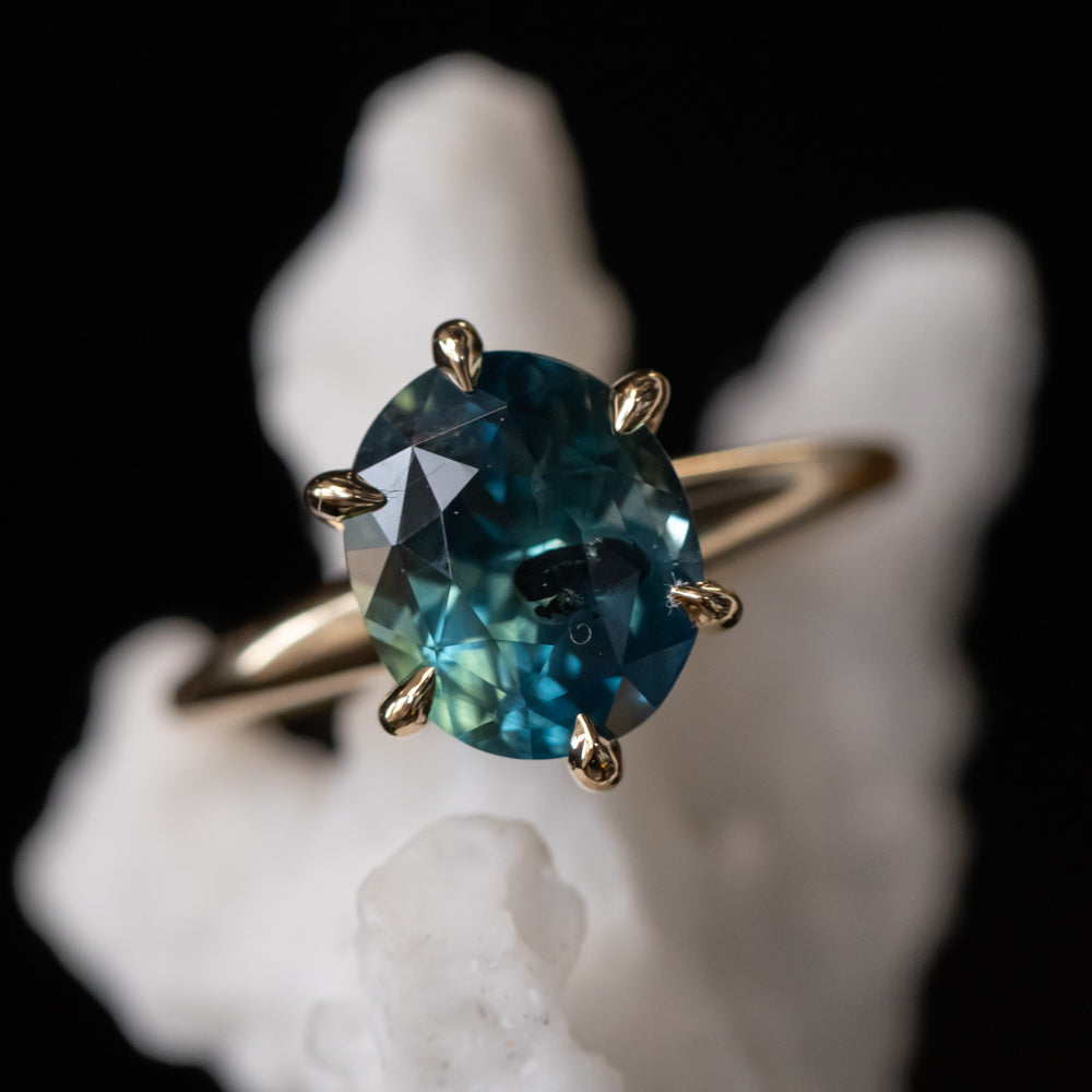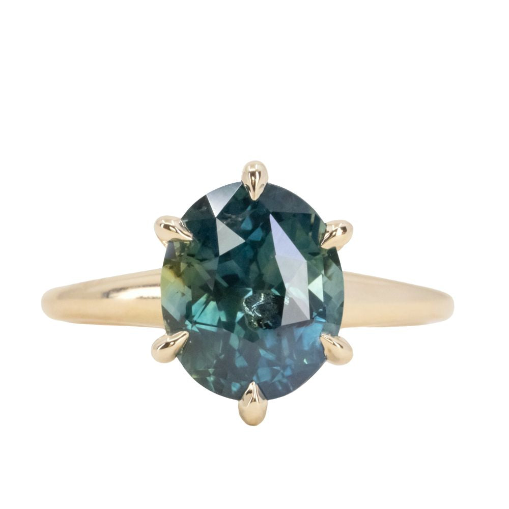 Combining antique Victorian elegance with a touch of sea-inspired charm, our Coral Six Prong Solitaire features smooth, tapered shoulders and connections like polished coral, and a large "claw like" basket setting. This new solitaire features a very rare 4ct earthy Montana sapphire blue oval, one of the largest sapphires we've had from this region in the USA.