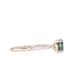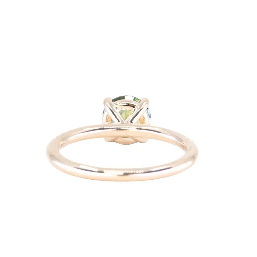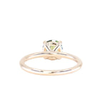 A classic 4-prong solitaire with white diamonds hand set into the top half of the band. The bottom portion of the band is left plain without diamonds for limited resizing in the future.