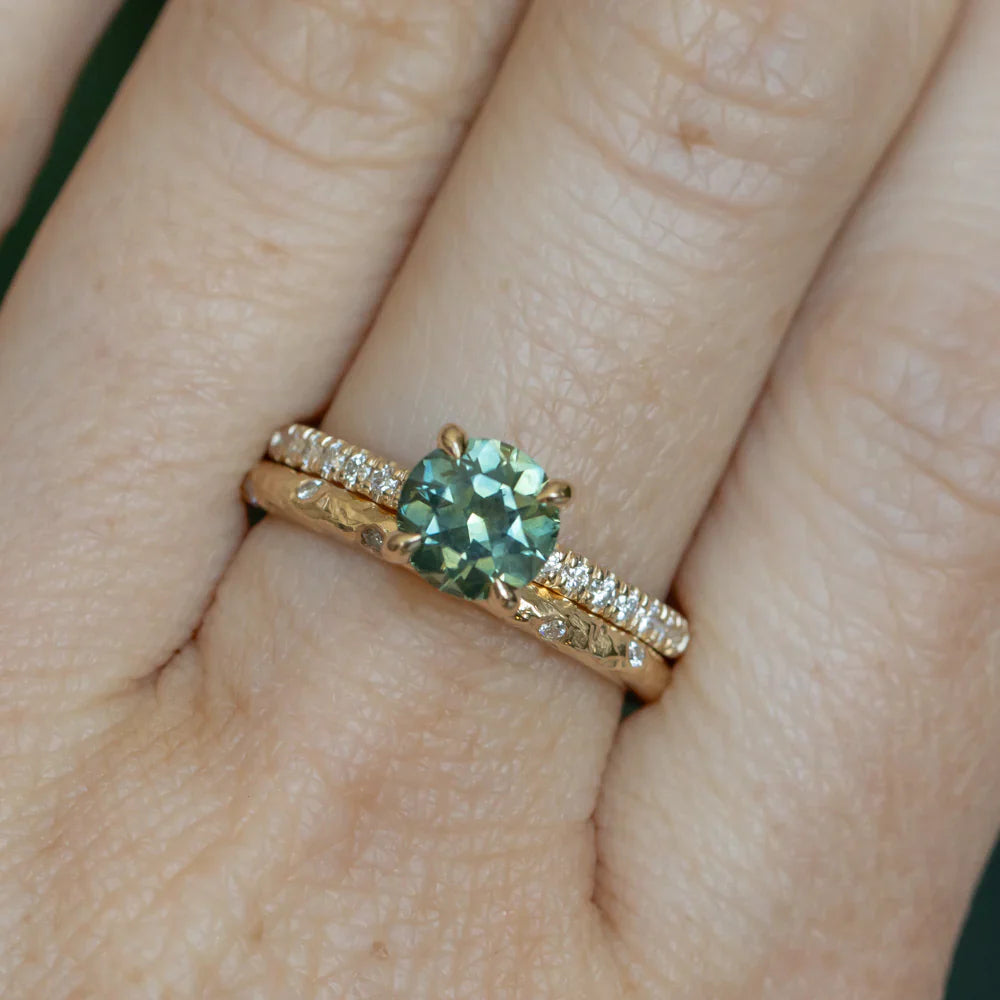 This style is best to order as close to your exact ring size as possible due to the nature of setting the diamonds in the band. This ring can be made in plain or textured (applied to the back half of the ring), and in a satin or polished finish.