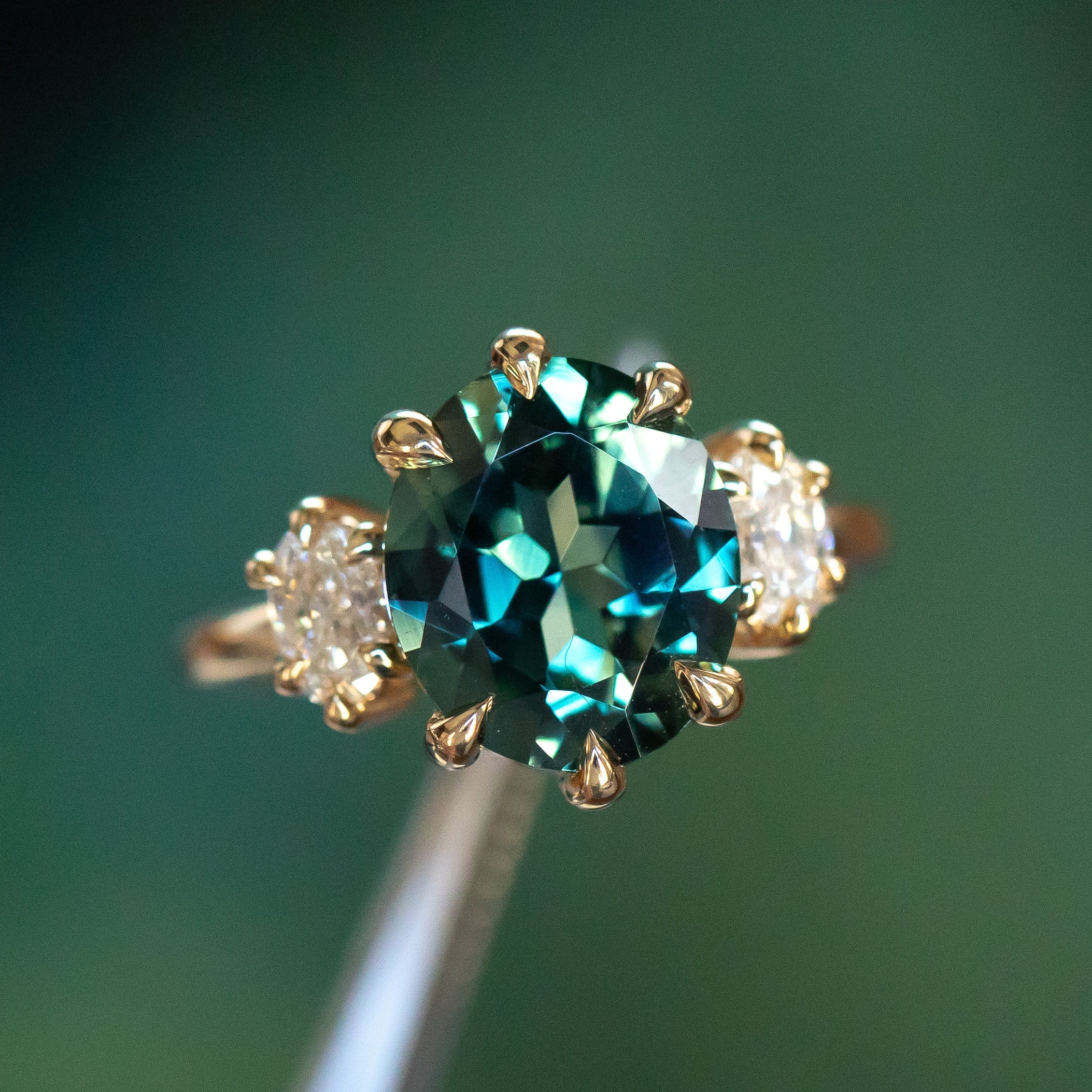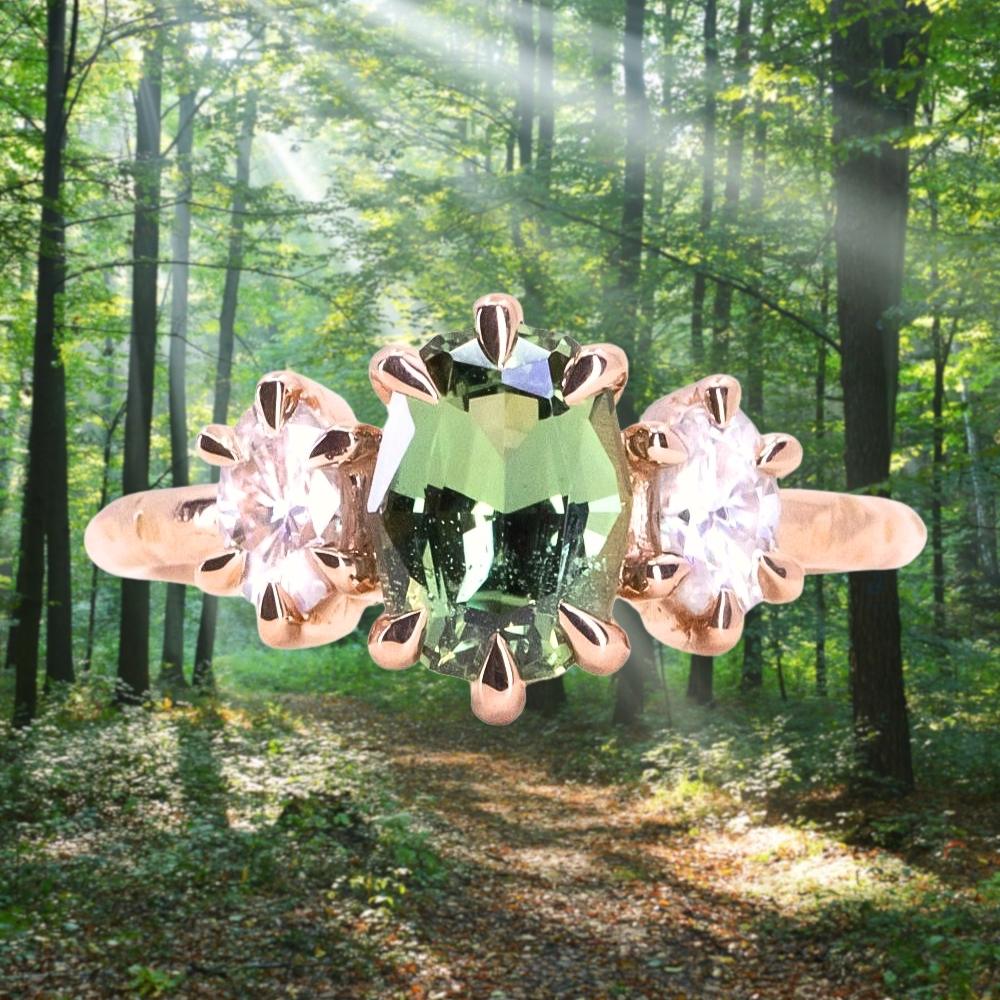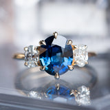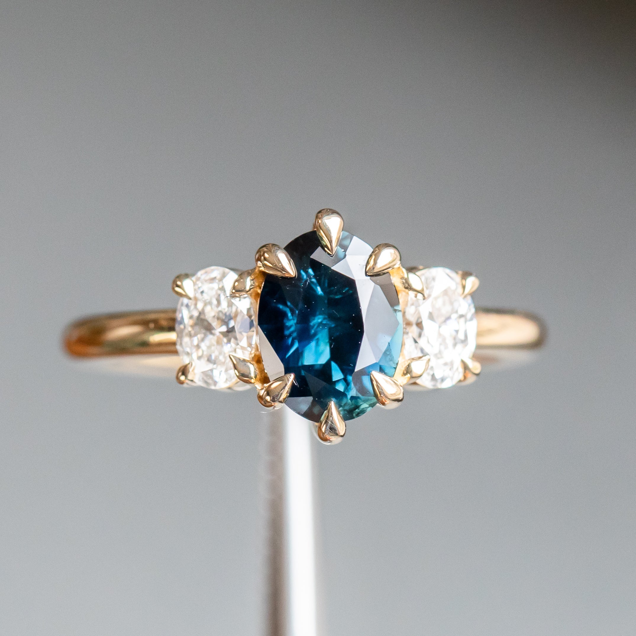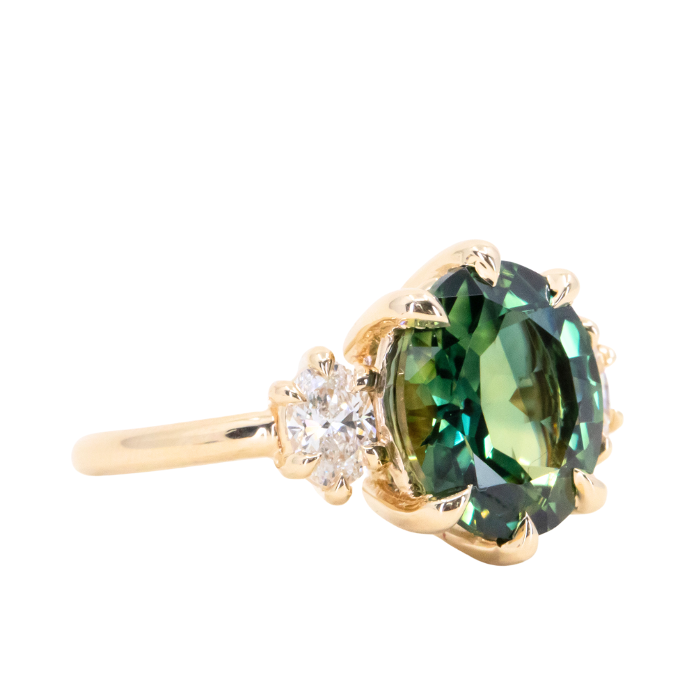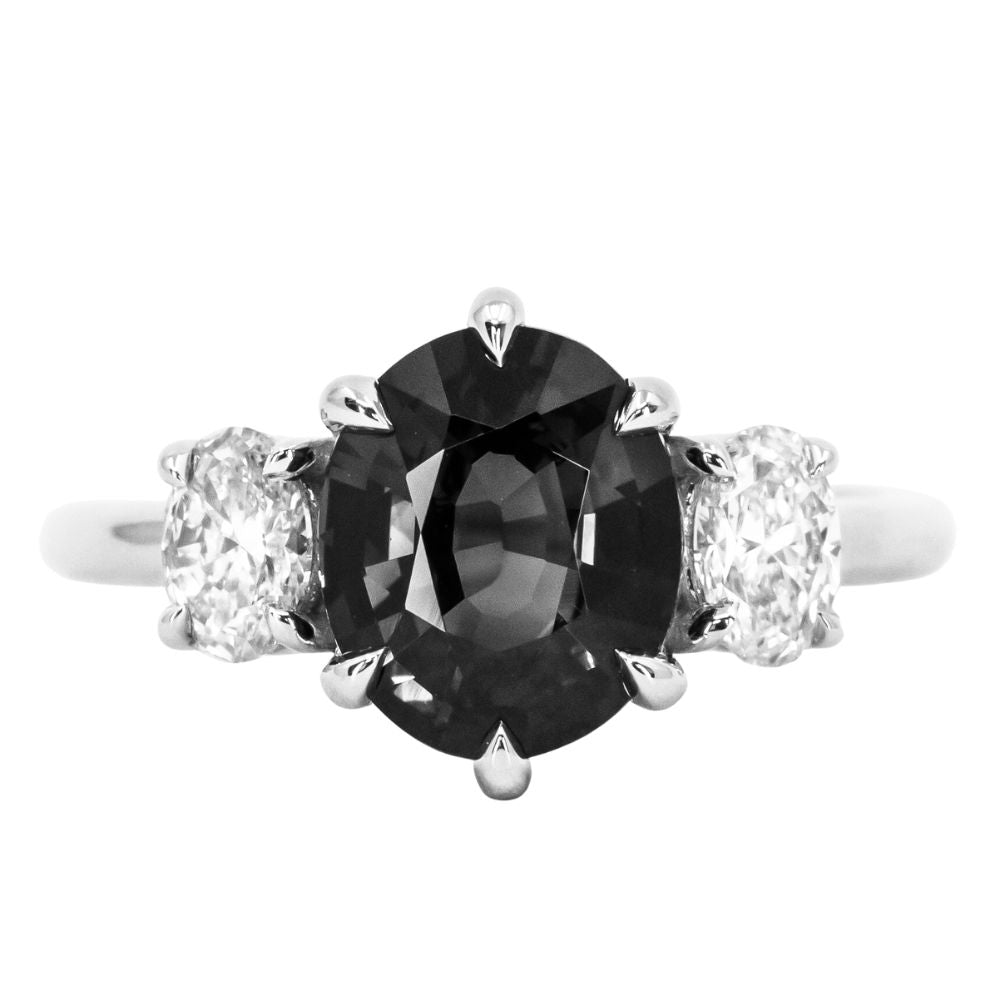 Center stone is perfectly place in skinny claw prongs, framed by two white oval diamonds weighing 0.54ctw with VS clarity and sparkle.