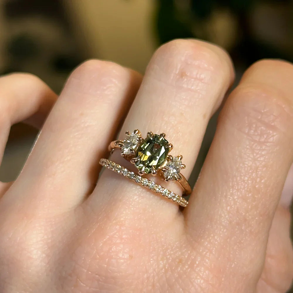 This setting is not stackable flush with straight bands. It would nest best with a custom curved or pointed band. This ring can be made plane or with our signature Evergreen texture, and can come in a satin or polished finish.