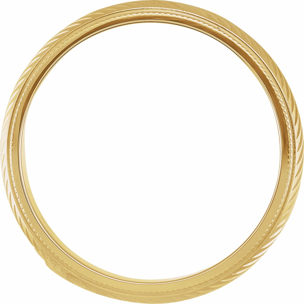 This distinguished solid band features intricately carved herringbone designs and is accented with delicate milgrain beading.