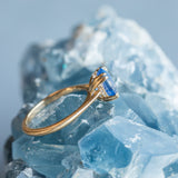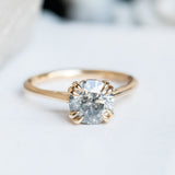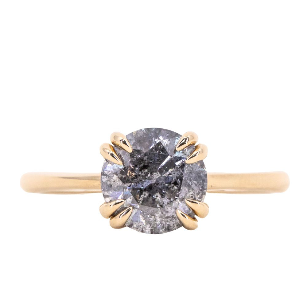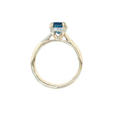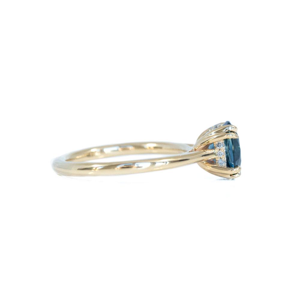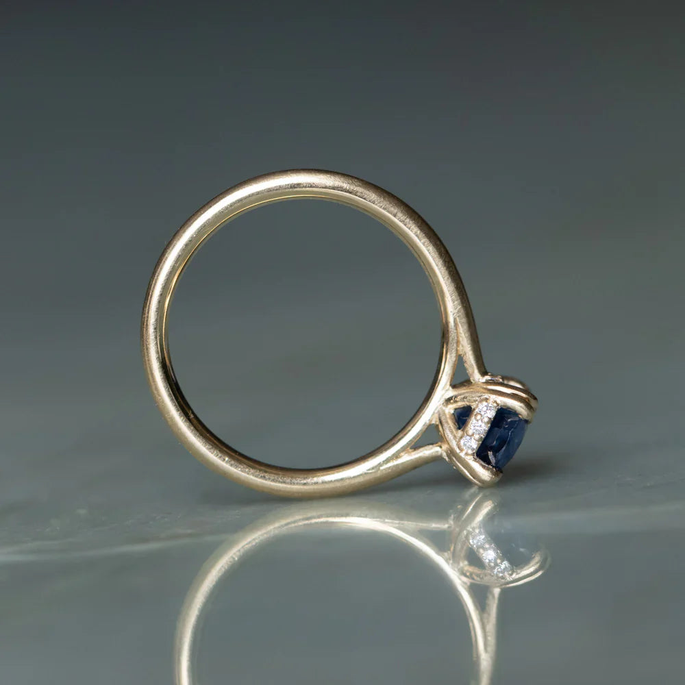 Elevate your classic four prong set stone with a sparkling diamond halo hidden on the side! This timeless profile is perfect for stacking with straight bands.
