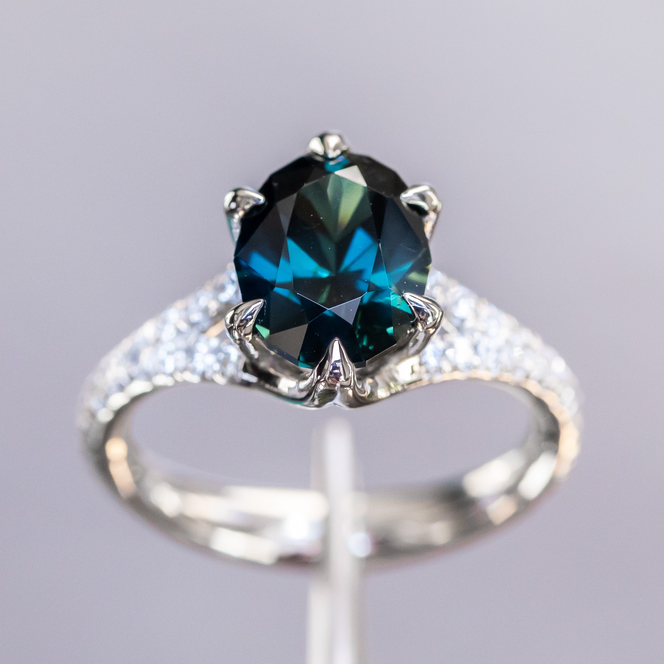 Another classic, antique-inspired favorite is this six prong solitaire setting that swoops elegantly to meet the center stone. There is a slight split shank in the shoulders of the ring. White conflict-free diamonds line the top half of this ring, with the bottom half left plain for small resizing in the future. This style is best to order as close to your exact ring size as possible due to the nature of setting the diamonds in the band.